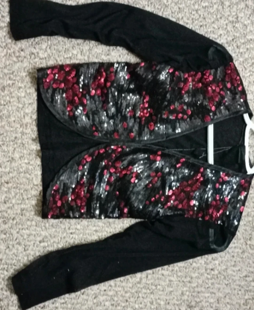 This black bolero cardigan is covered in shimmering sequins with red and silver accents. It features long sleeves and an open front design.