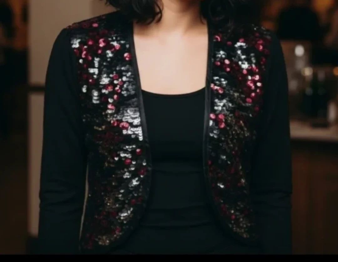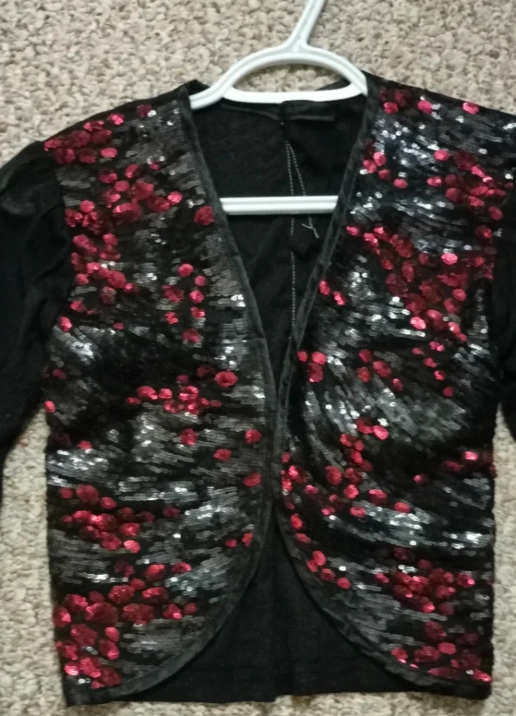 This black bolero cardigan is covered in shimmering sequins with red and silver accents. It features long sleeves and an open front design.