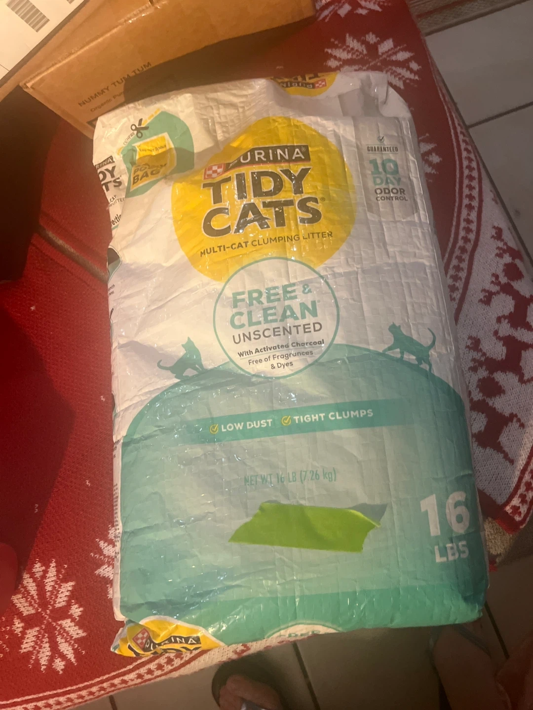This is a 16 lb bag of Purina Tidy Cats Free & Clean Unscented Multi-Cat Clumping Litter. It's made with activated charcoal and is free of fragrances and dyes. Guaranteed 10-day odor control, low dust, and tight clumping action.