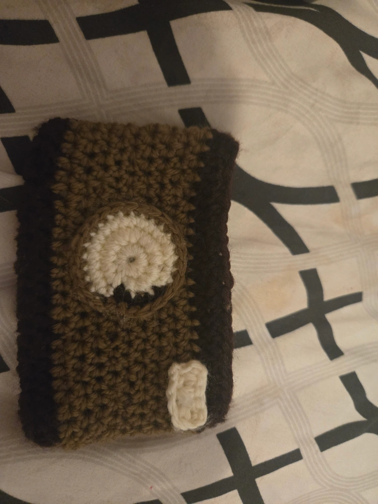 Check out this adorable handmade crochet pouch! It's brown, beige, and cream, and looks like it could be perfect for holding small items like a phone or some makeup. It has a cute little circular design on the front and a small rectangular detail at the bottom. It's in great condition and ready for a new home! but u have to add your own button
