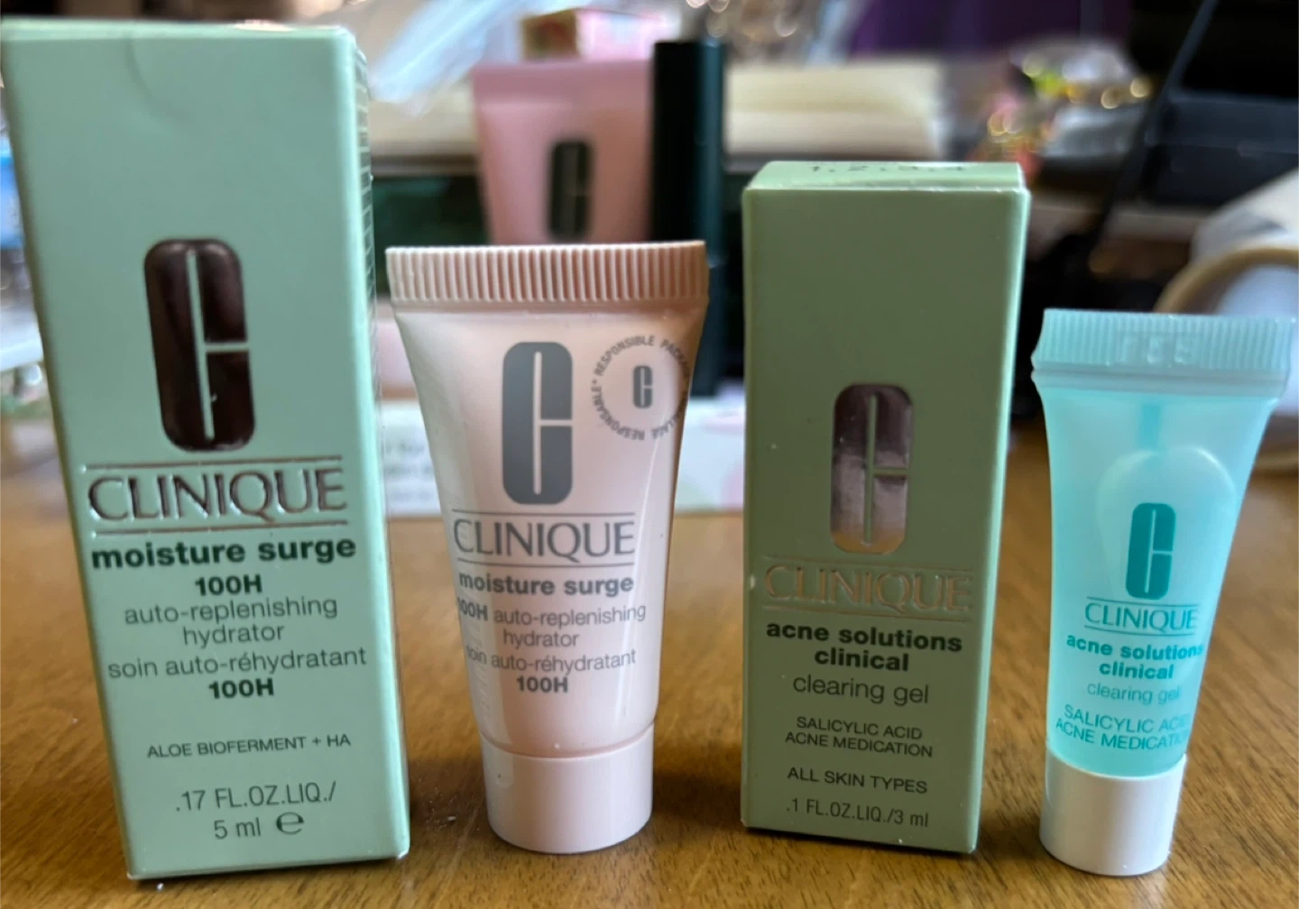 Clinique Moisture Surge 100H Auto-Replenishing Hydrator is 5ml. Acne Solutions Clinical Clearing Gel is 3ml. Both are new in box. Great for travel!