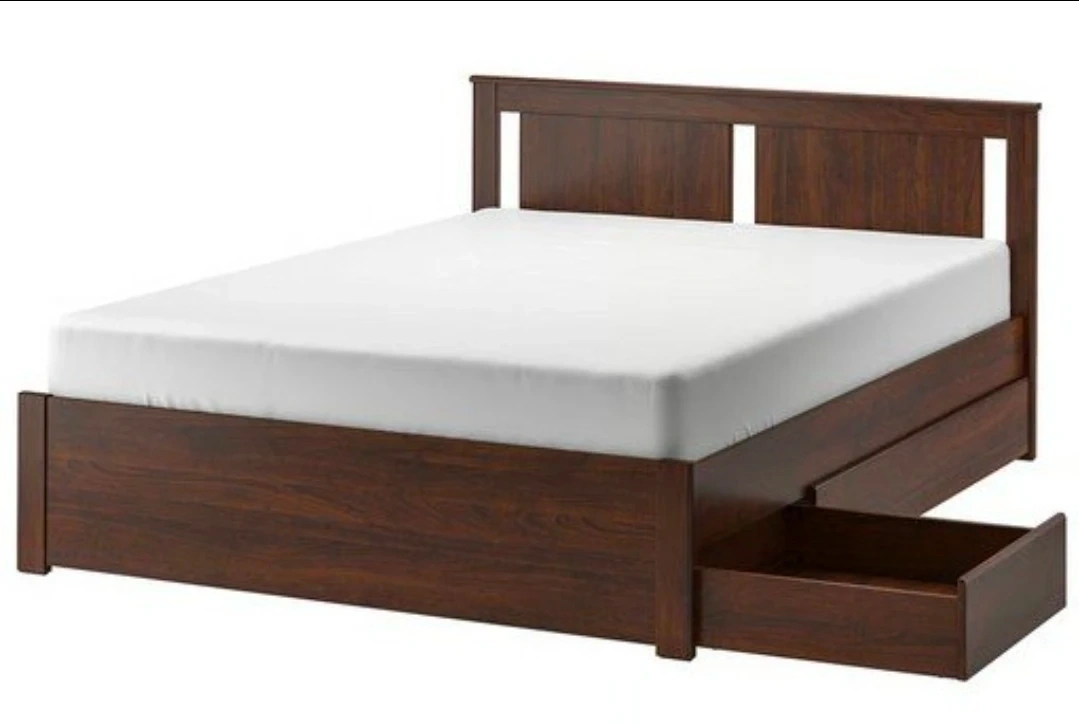Dark wood bed frame with a modern headboard. Includes 4 built-in storage drawers underneath. Solid wood construction. Brand Ikea.