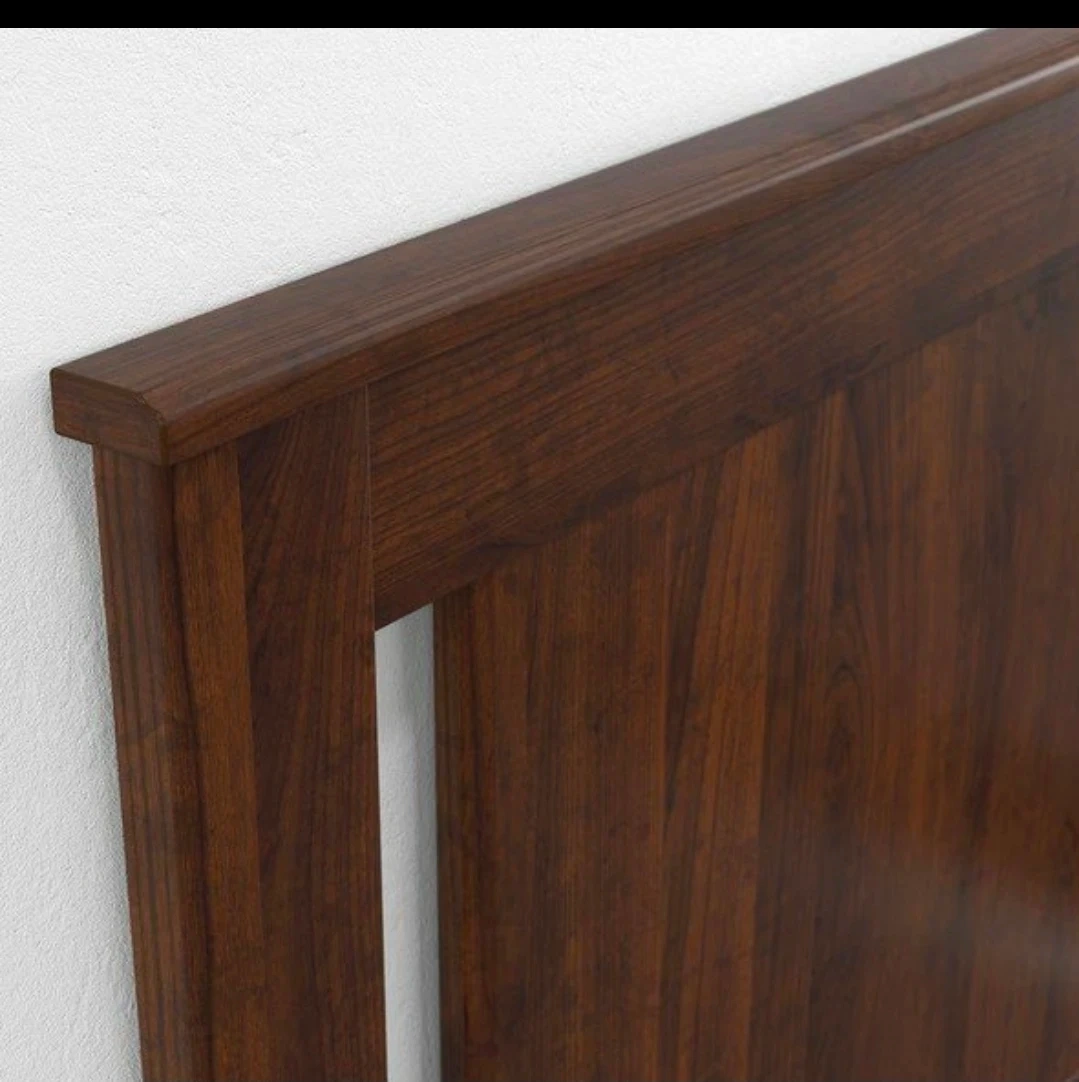 Dark wood bed frame with a modern headboard. Includes 4 built-in storage drawers underneath. Solid wood construction. Brand Ikea.