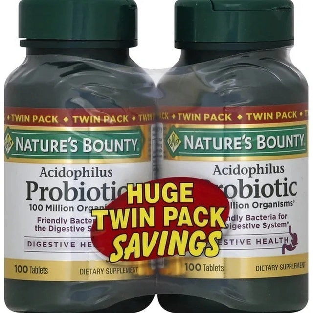 Get your gut health in check with this Nature's Bounty Acidophilus Probiotic twin pack, containing 200 tablets in total. These probiotics contain 100 million organisms per tablet to support a healthy digestive system. This is a twin pack of two 100 tablet bottles. The expiration date is March 2026. These are new and sealed. Brand: Nature's Bounty, Type: Acidophilus Probiotic, Quantity: 200 Tablets (100 Tablets per Bottle), Expiration: March 2026. Cash accepted.