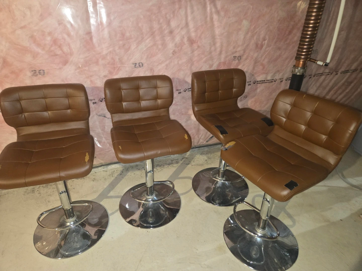 Selling a set of four adjustable bar stools in a brown faux leather. They feature a tufted design and a chrome base with a footrest. Some minor wear and tear is visible on the seats.