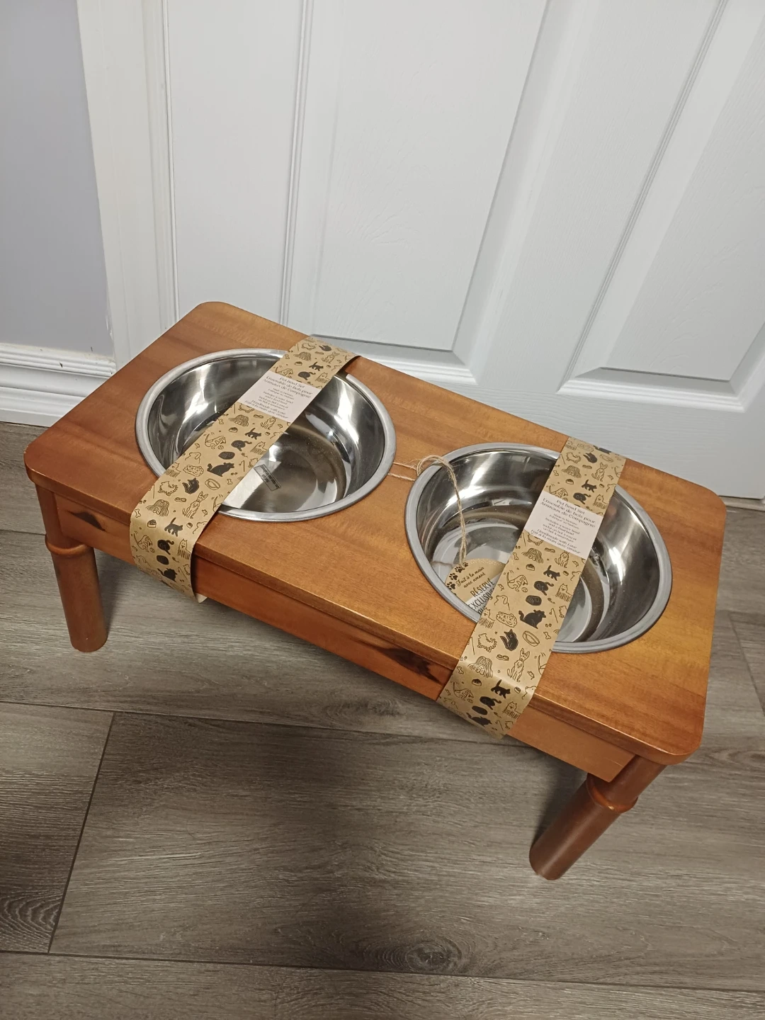 Wood stand keeps bowls stable. Easy for pets to access food and water.