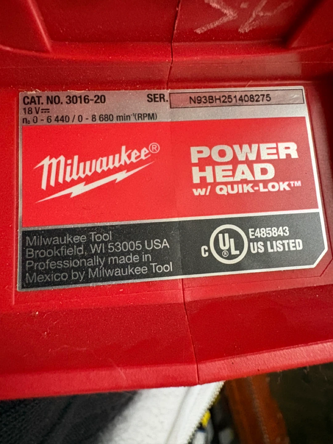 Milwaukee 18V cordless power head with QUIK-LOK™ attachment system. Cat. No. 3016-20. No-load speed is 0-6,440 / 0-8,680 RPM. It's professionally made in Mexico by Milwaukee Tool. This is a power head only.