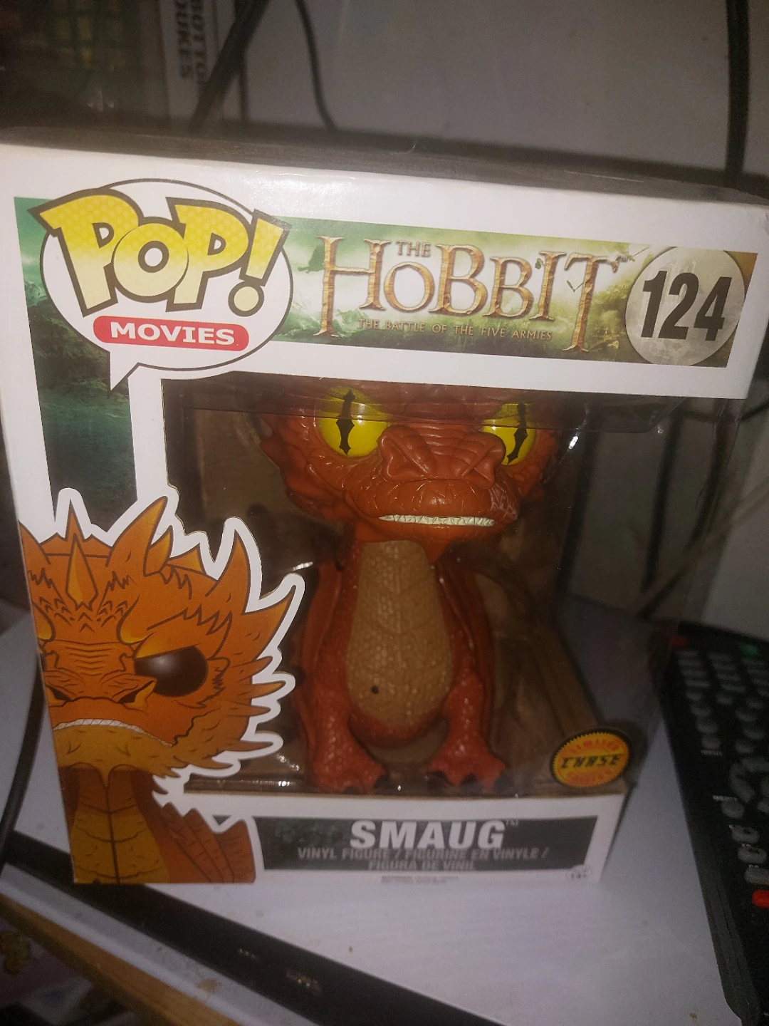 This is a Funko Pop! Movies vinyl figure of Smaug from The Hobbit: The Battle of the Five Armies. It's figure number 124 in the series and includes its original box. It's a Chase edition!