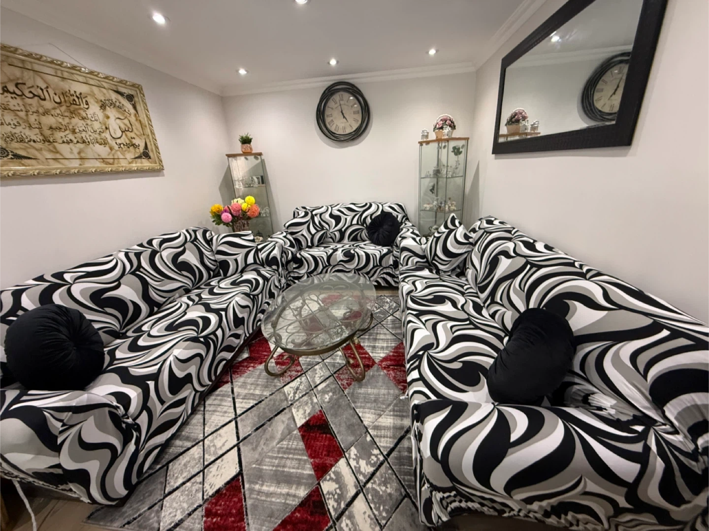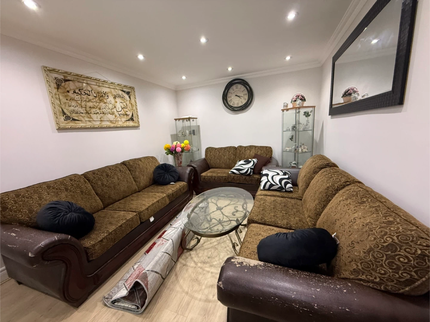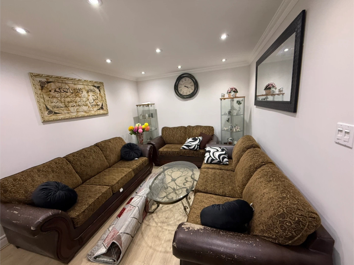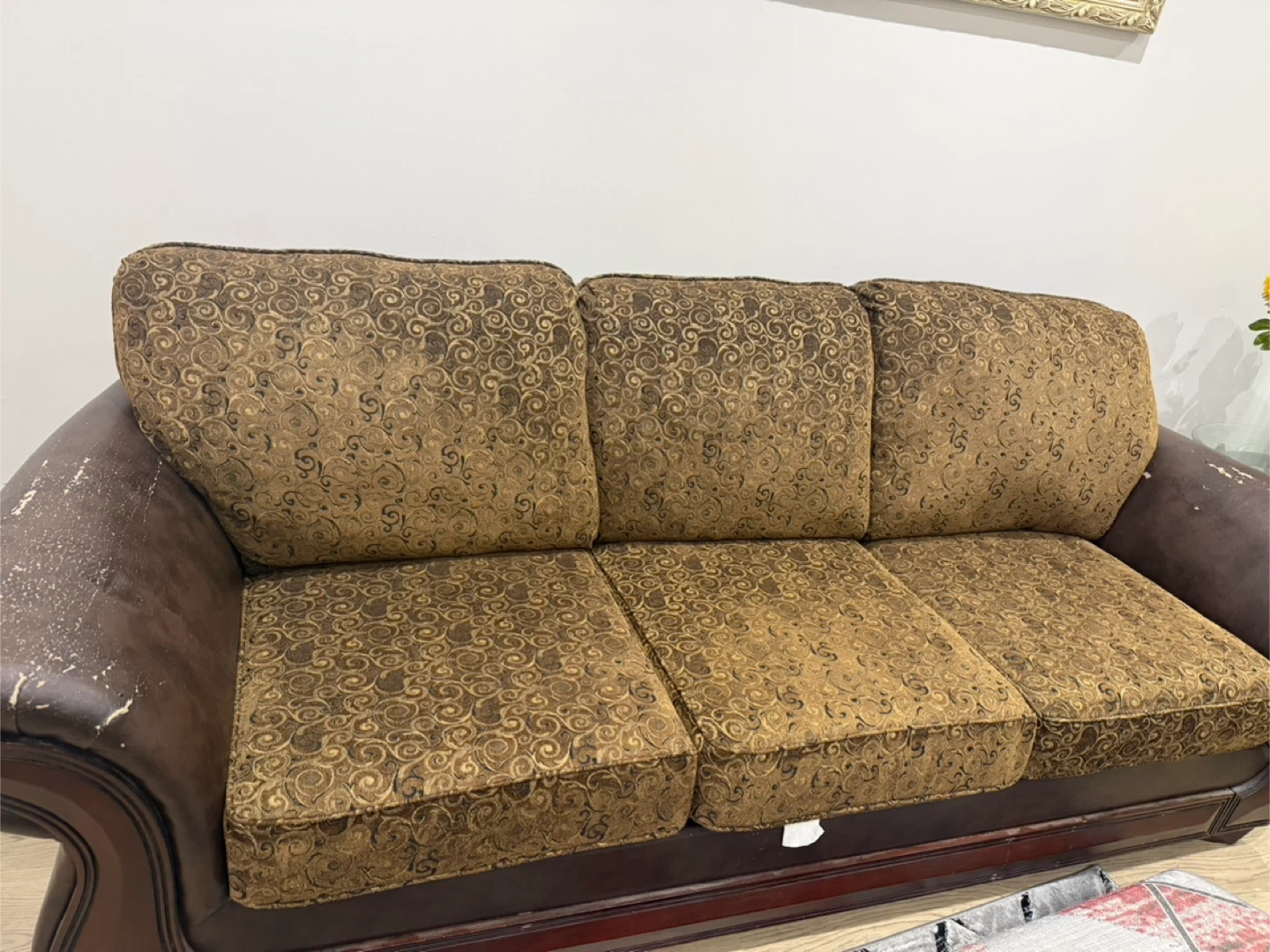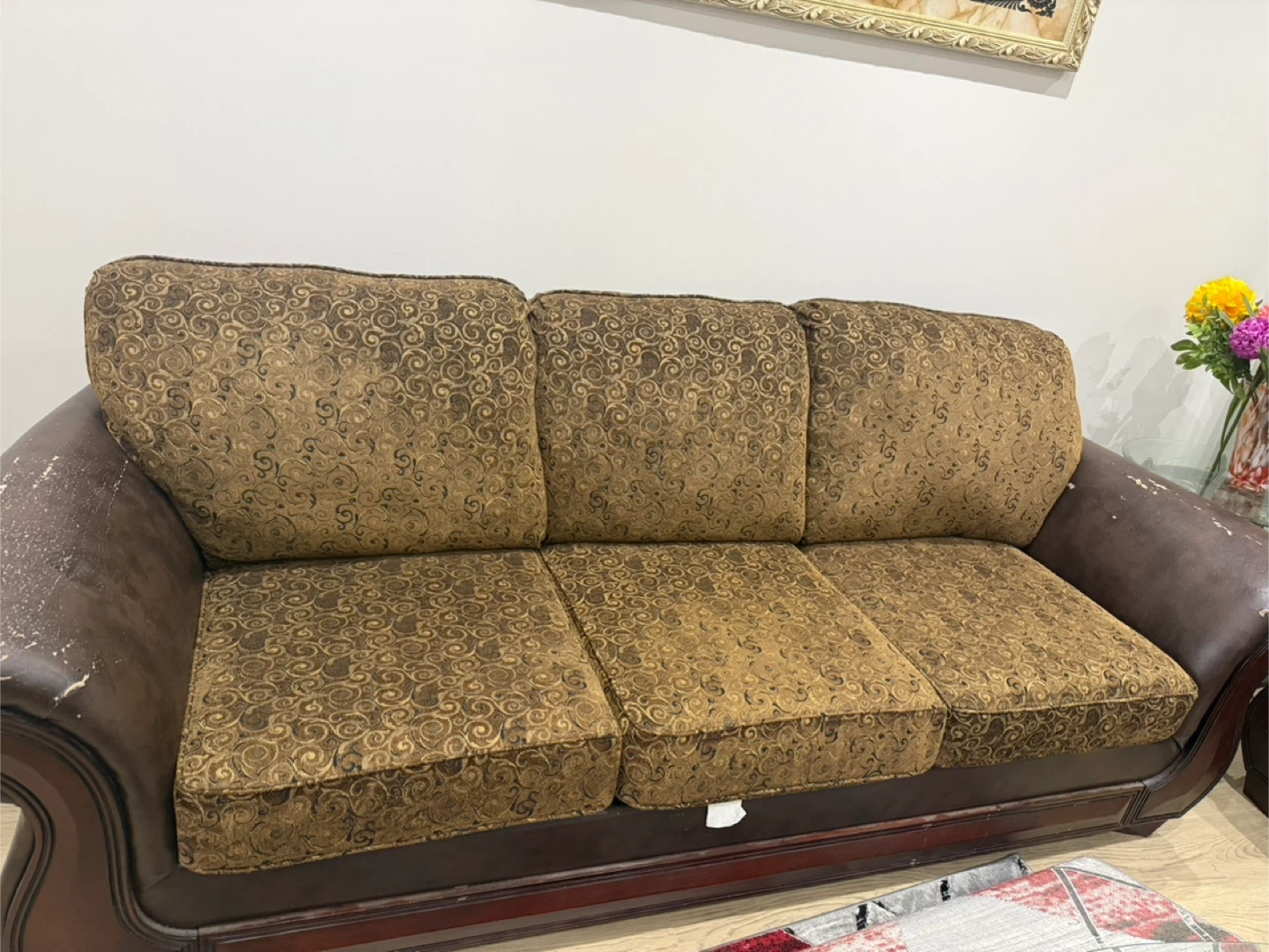 This sectional sofa features a brown patterned fabric with dark wood trim. The set includes a sofa and a loveseat. It's suitable for a living room or family room.