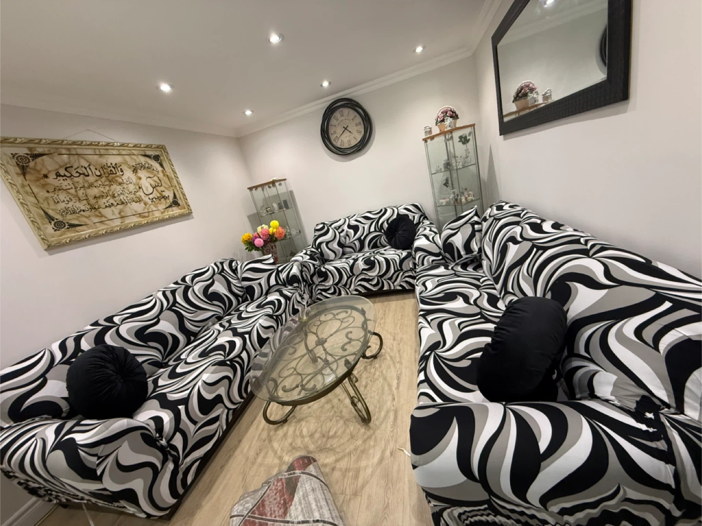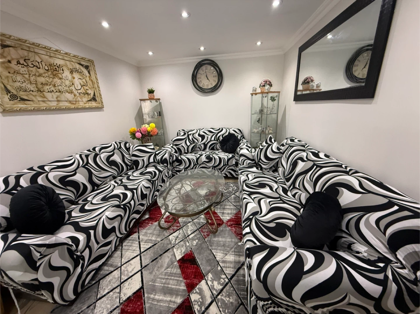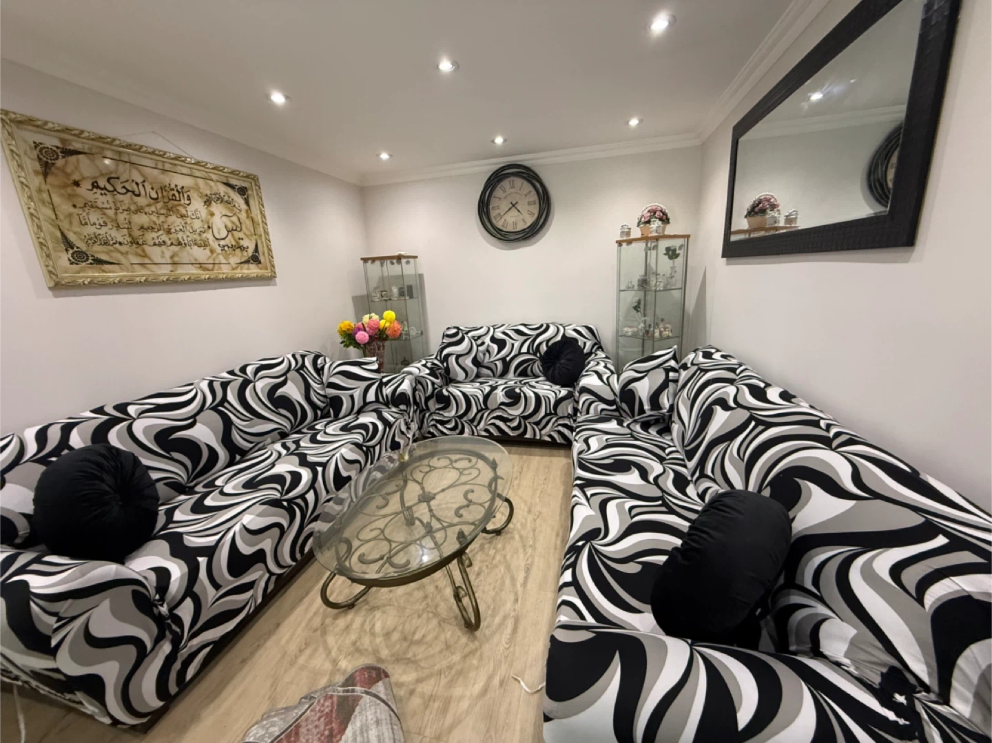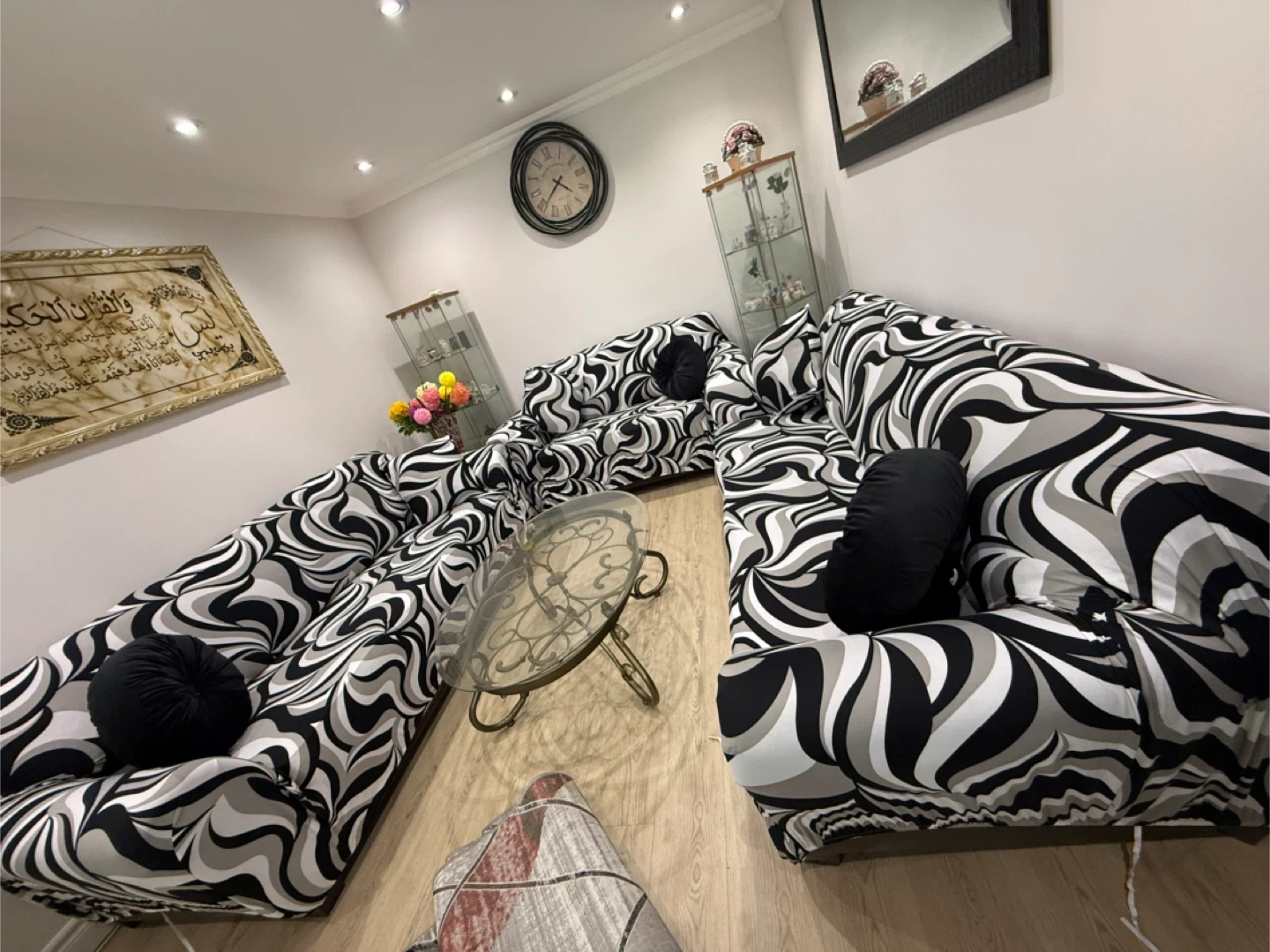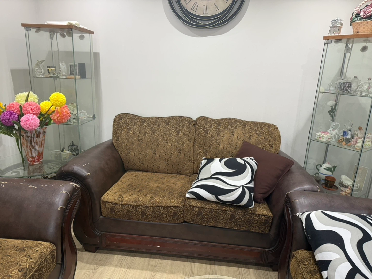 This sectional sofa features a brown patterned fabric with dark wood trim. The set includes a sofa and a loveseat. It's suitable for a living room or family room.