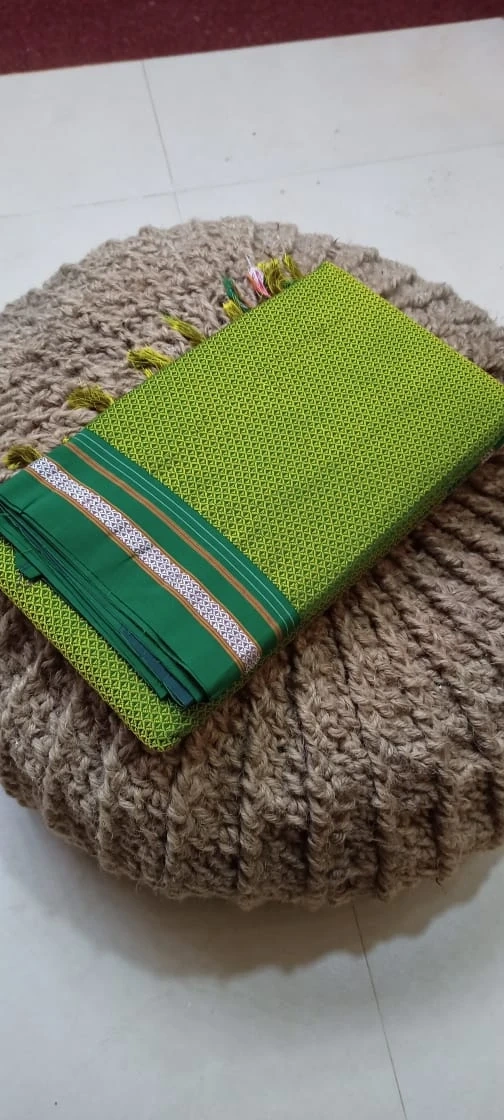 Traditional woven khun saree in a vibrant green hue. Features a textured pattern and decorative striped border with tassels. It's made from woven fabric. Suitable for cultural events or daily wear.