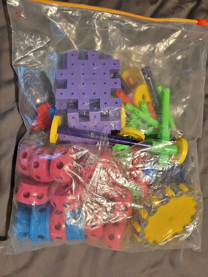 Colorful mix of SuperStructs and Quercetti building blocks. Has lots of different shapes and colors, including gears, rods, and connectors. Great for creative play!