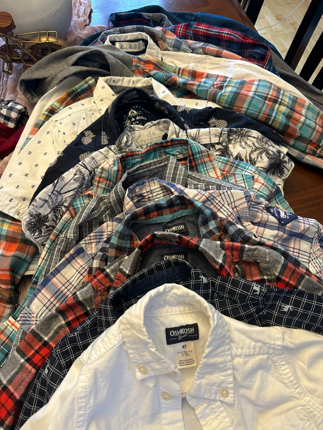 Large bundle of boys' long-sleeve shirts. Various colours and patterns. Mostly plaid. Sizes 4T and 5T. Great for fall and winter. (26 pieces)