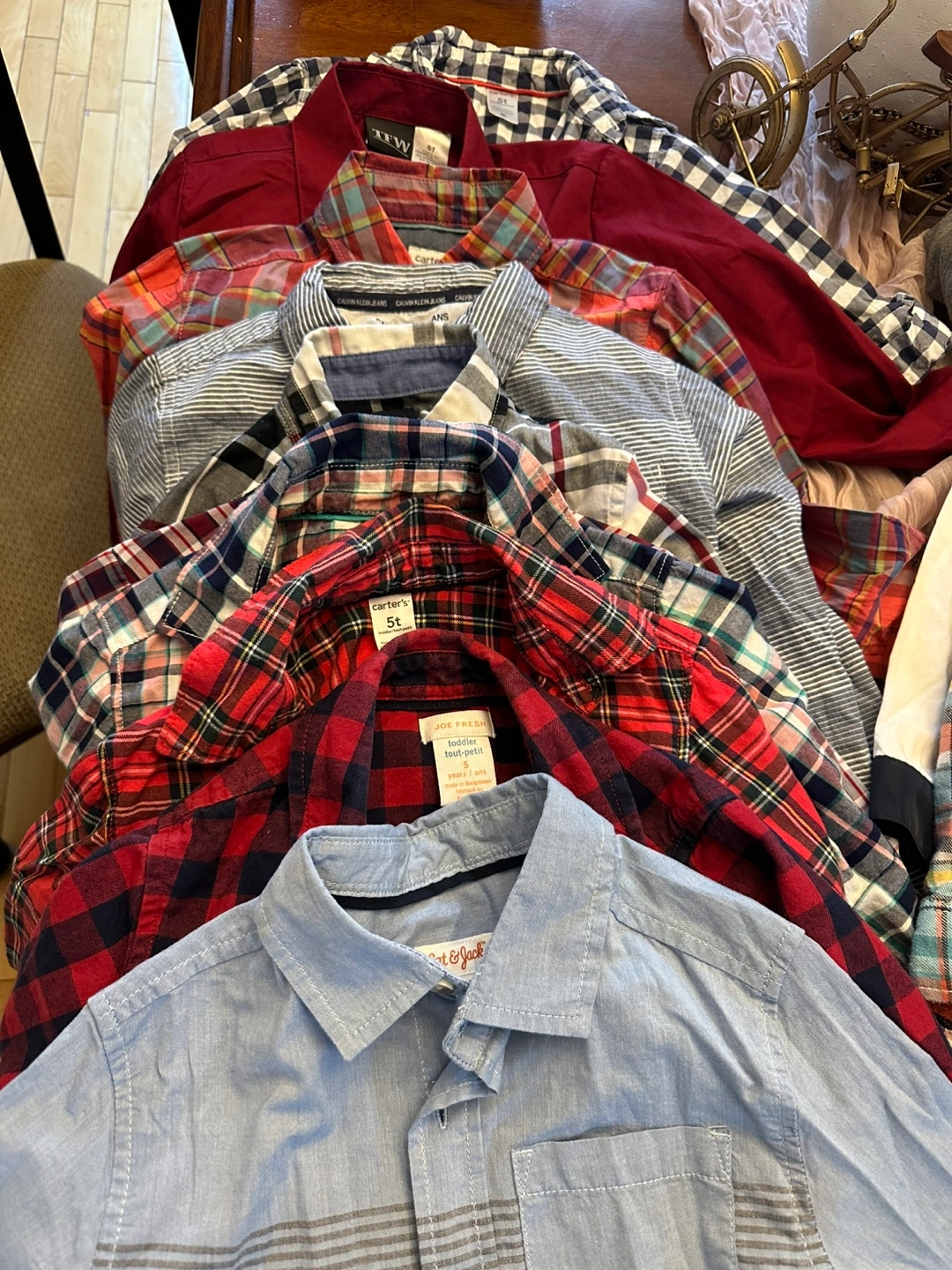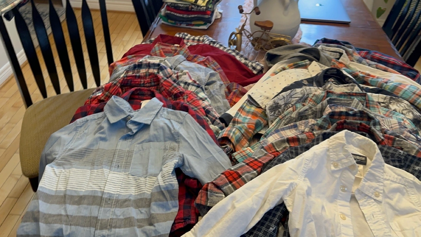 Large bundle of boys' long-sleeve shirts. Various colours and patterns. Mostly plaid. Sizes 4T and 5T. Great for fall and winter. (26 pieces)