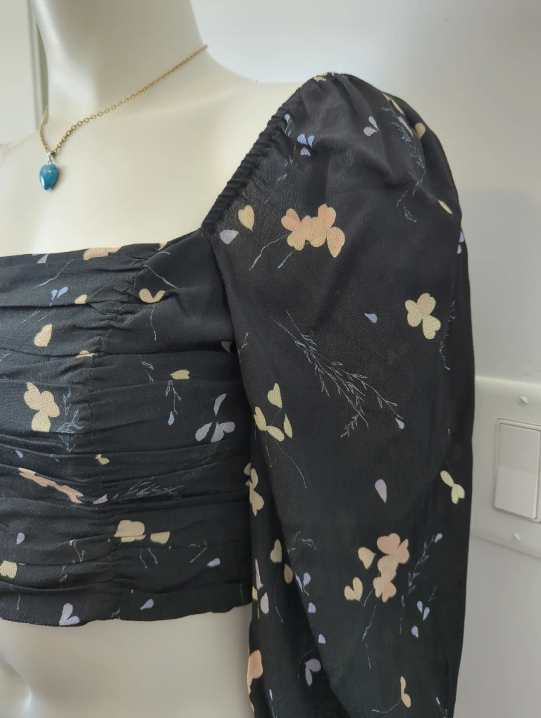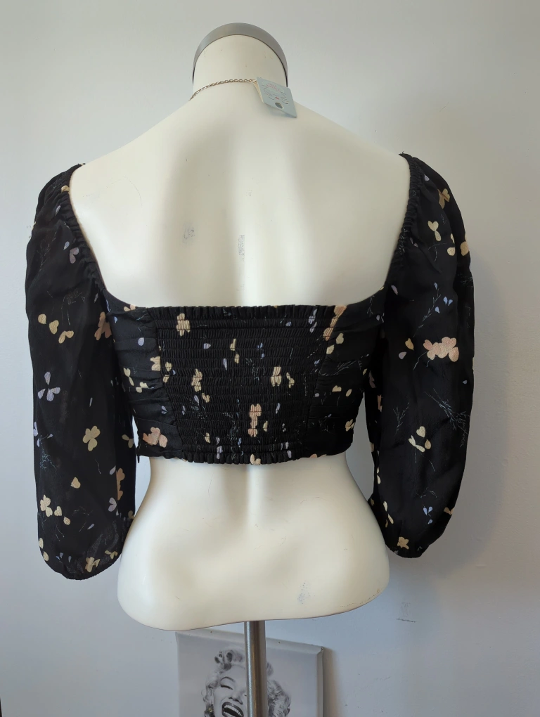 Cute black crop top. Features puff sleeves and a square neckline. Floral print throughout. Size small. Made in Vietnam.
