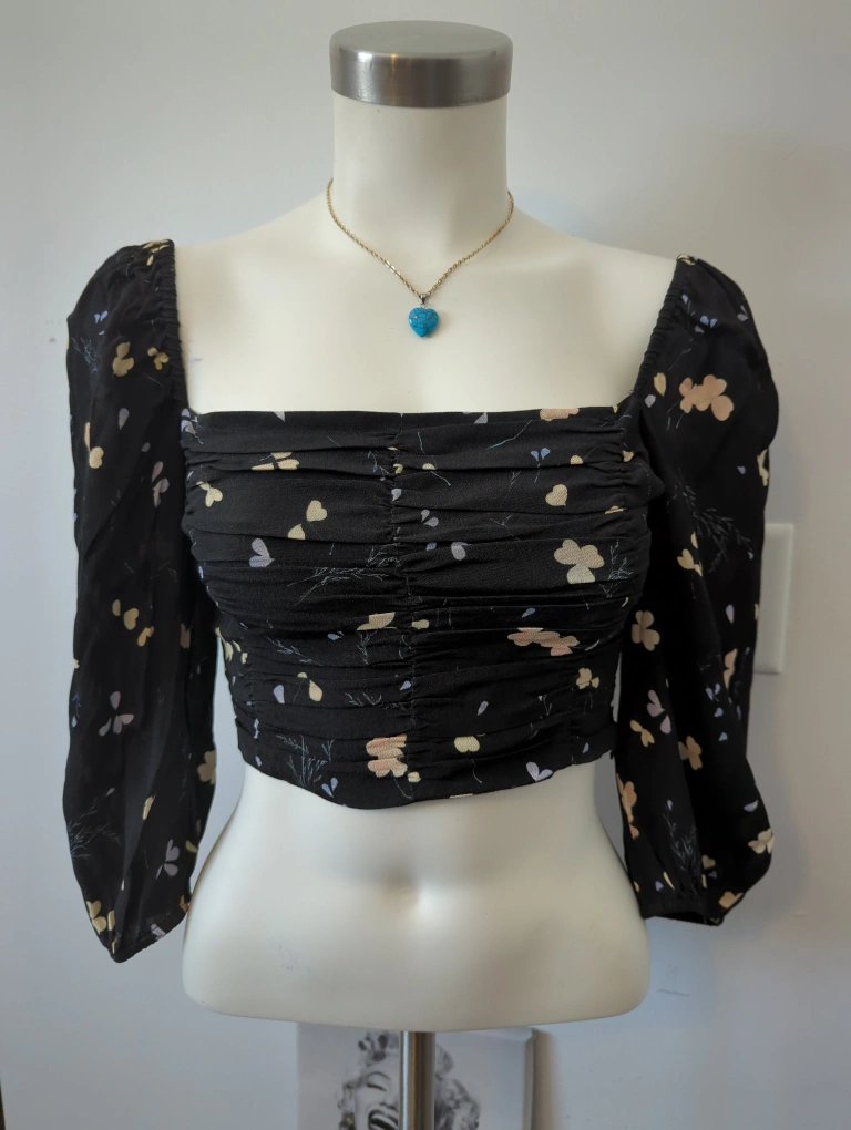 Cute black crop top. Features puff sleeves and a square neckline. Floral print throughout. Size small. Made in Vietnam.
