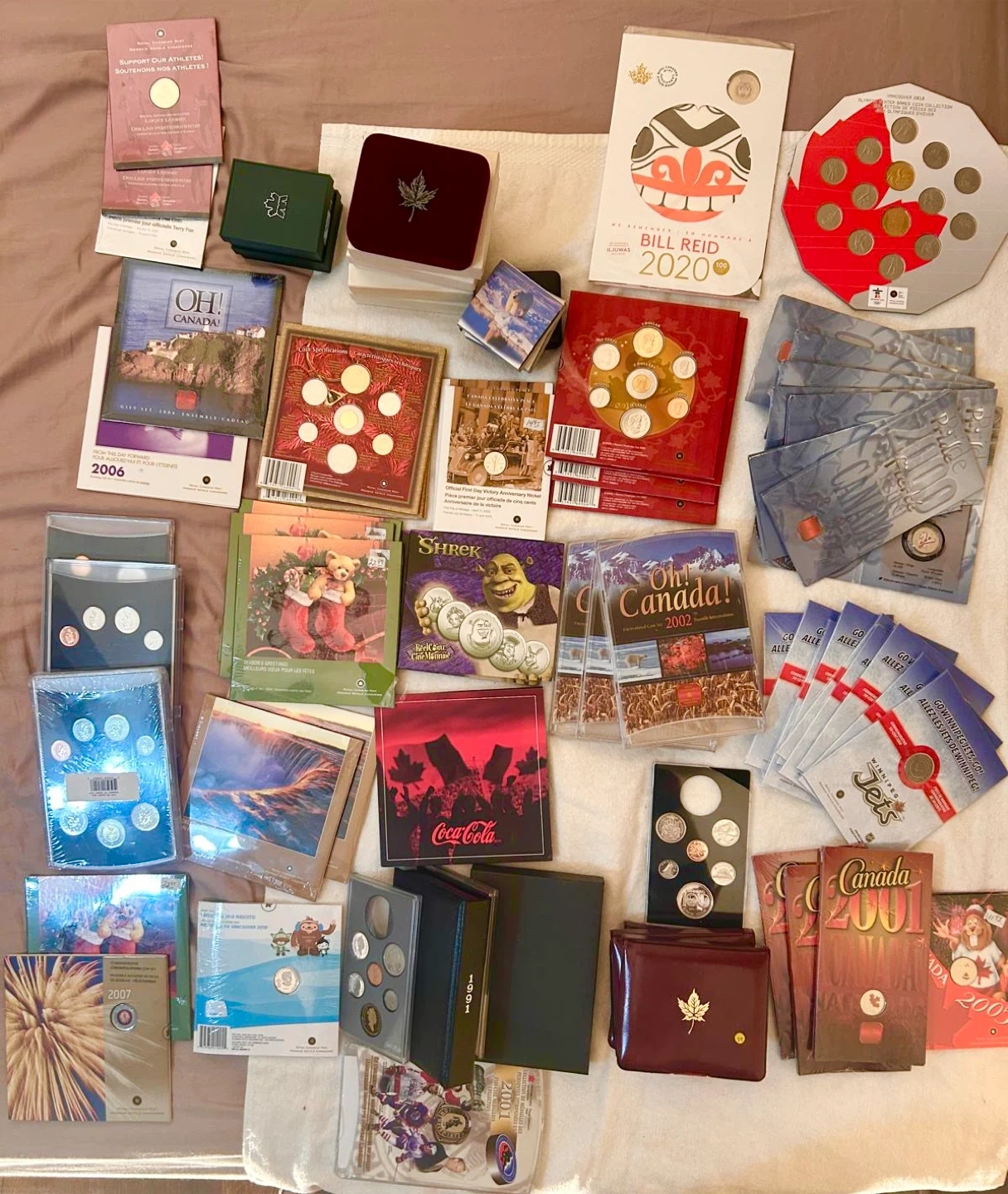 This is a diverse collection of Canadian coins and commemorative sets. It includes items from various years and special issues. Many sets come in their original packaging or protective cases.