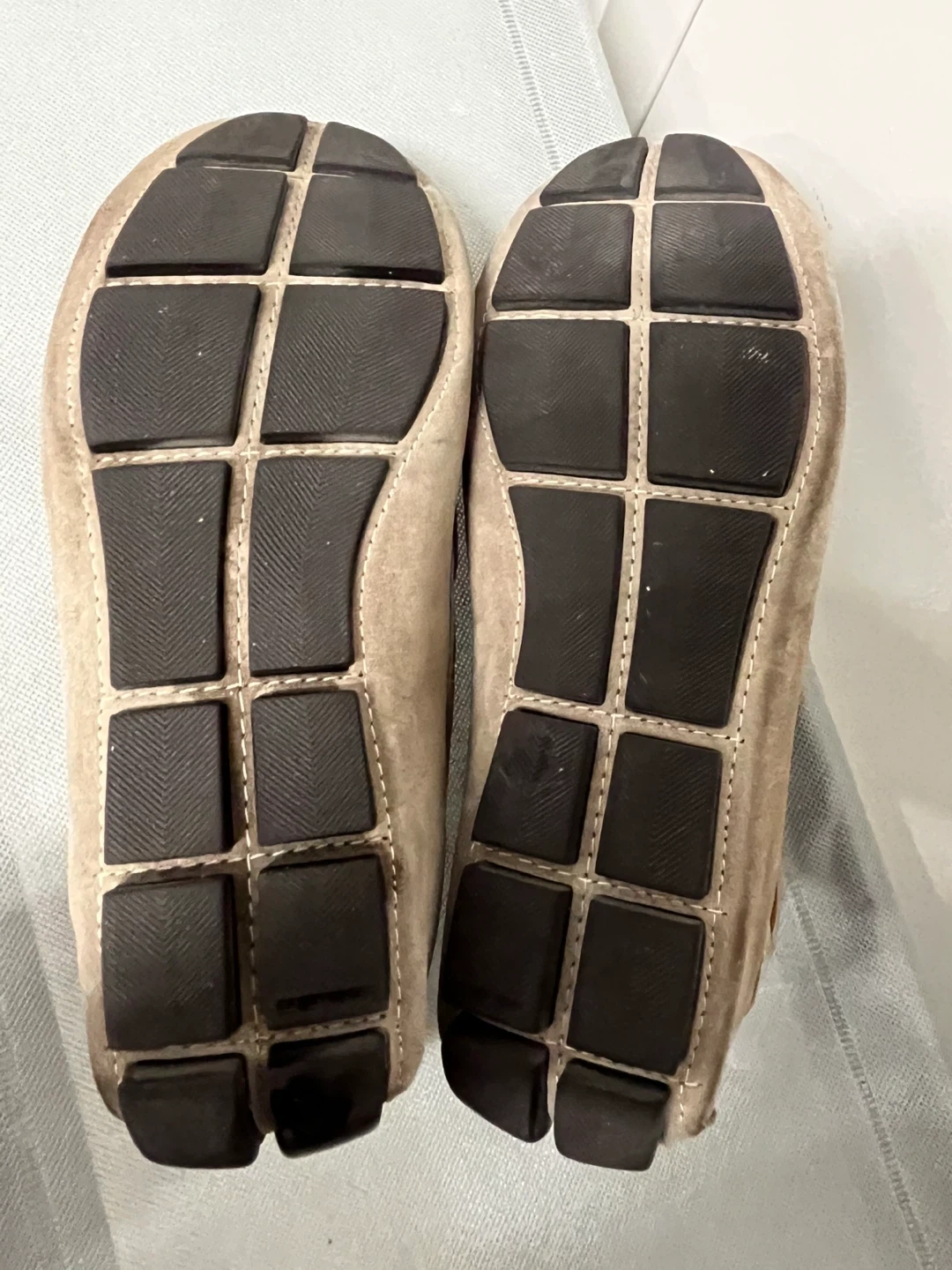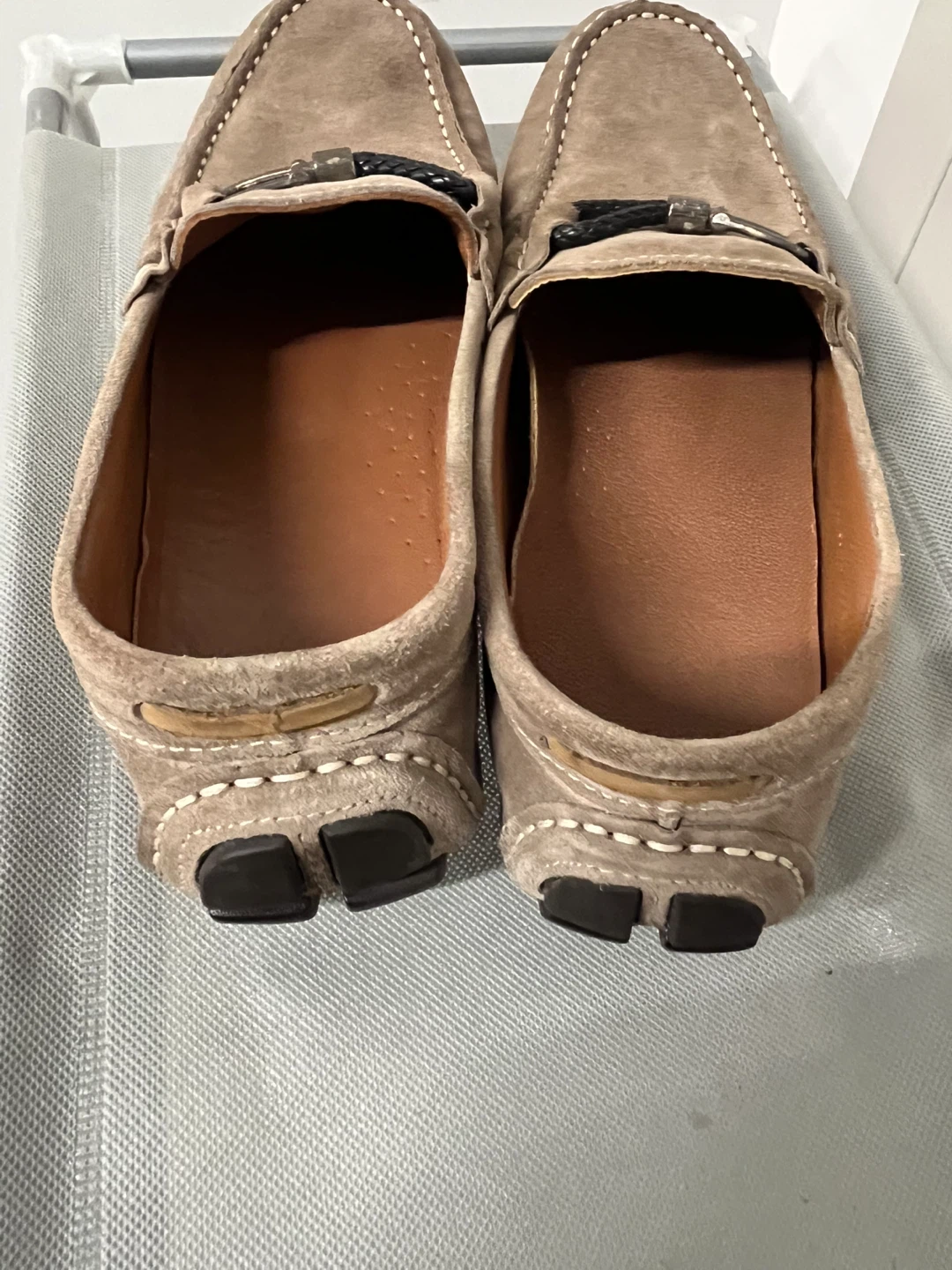 Comfortable taupe suede loafers with a decorative metal buckle and braided detail. These shoes are size 41. The rubber sole offers good traction. Perfect for a casual day out!
