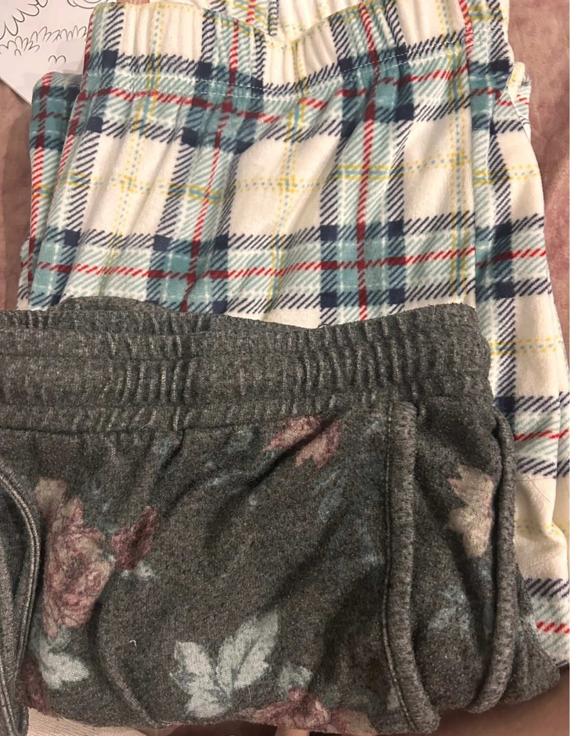 Comfy fleece pajama pants. One pair features a classic plaid pattern with white, blue, red, and yellow. The other has a dark grey background with a floral and leaf print. Elastic waistbands with drawstrings for a relaxed fit they are pj shorts