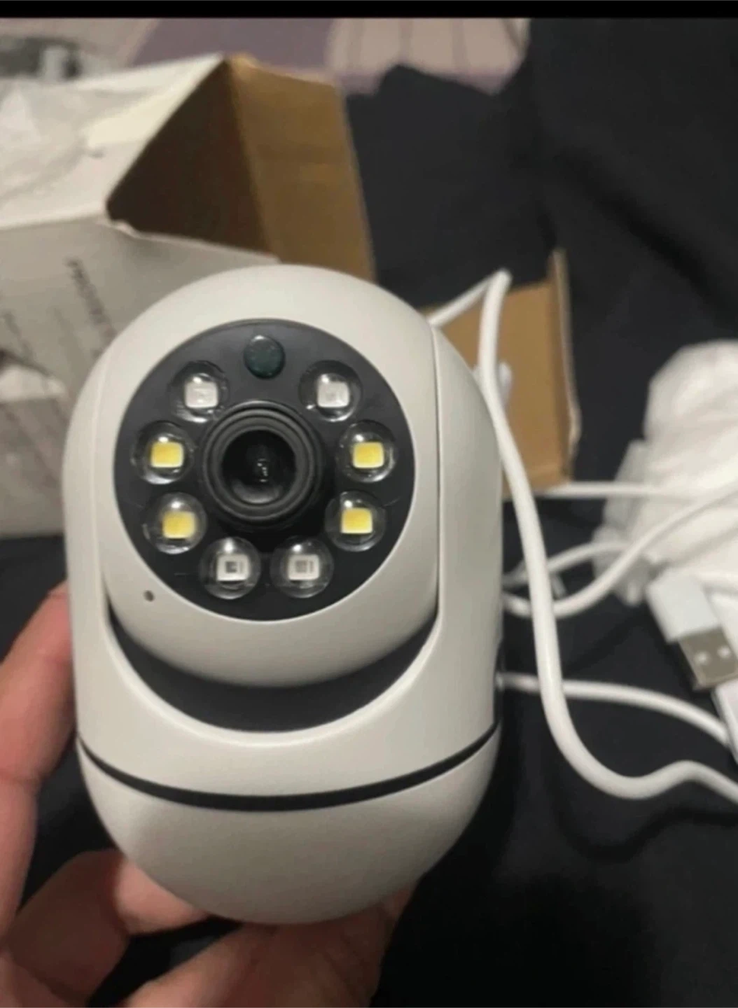 This white indoor security camera features multiple LED lights for night vision. It comes with a USB power cable. It's suitable for monitoring your home or pets.