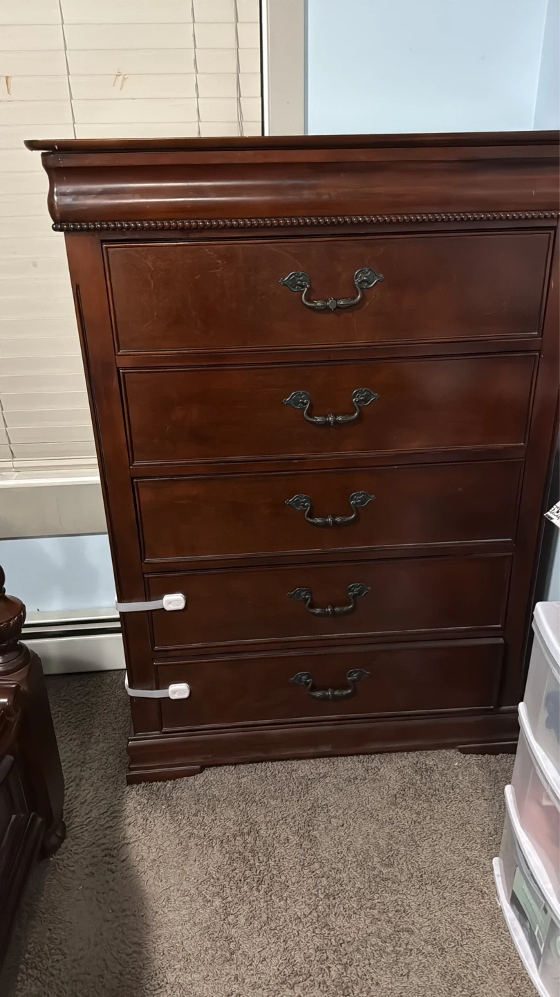 This is a dark wood 5-drawer chest. It features ornate drawer pulls and decorative trim along the top. Drawer locks are attached to the front. Plenty of storage space available!