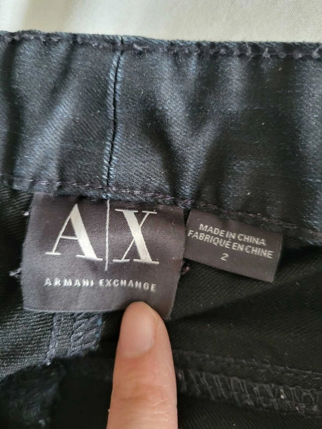 Check out these stylish Armani Exchange pants, perfect for a chic, casual look. These pants are a women's size 2 and have a sleek, dark wash. Being pre-loved, they've got a story to tell, but are still in great shape for strutting around town. The material is 64% Cotton, 32% Polyester and 4% Spandex. For Sale By: Owner. Cash accepted.