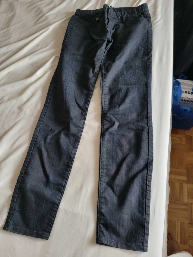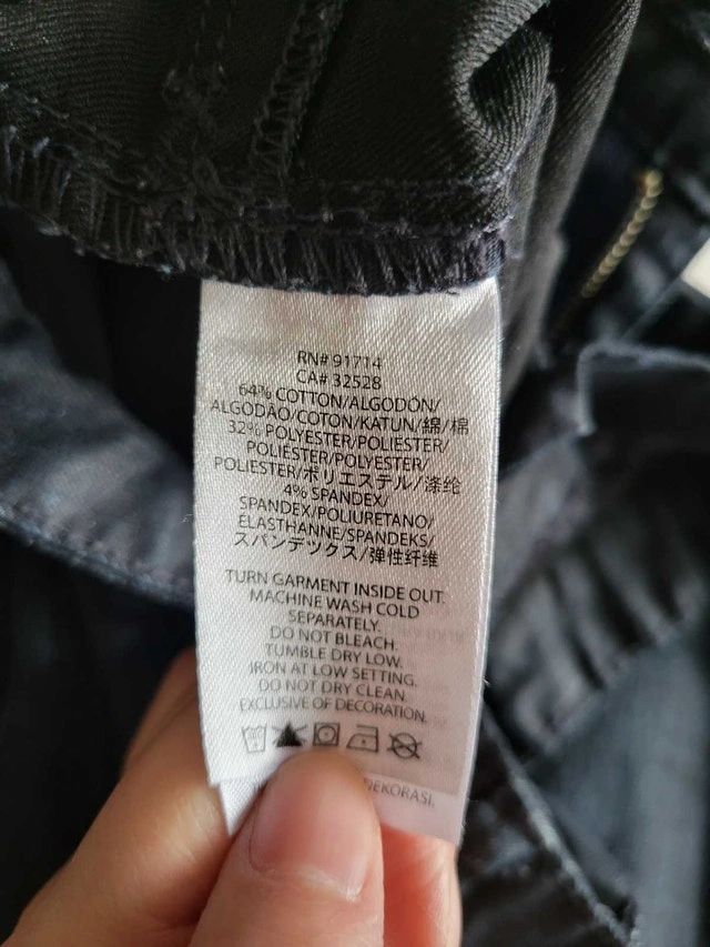 Check out these stylish Armani Exchange pants, perfect for a chic, casual look. These pants are a women's size 2 and have a sleek, dark wash. Being pre-loved, they've got a story to tell, but are still in great shape for strutting around town. The material is 64% Cotton, 32% Polyester and 4% Spandex. For Sale By: Owner. Cash accepted.