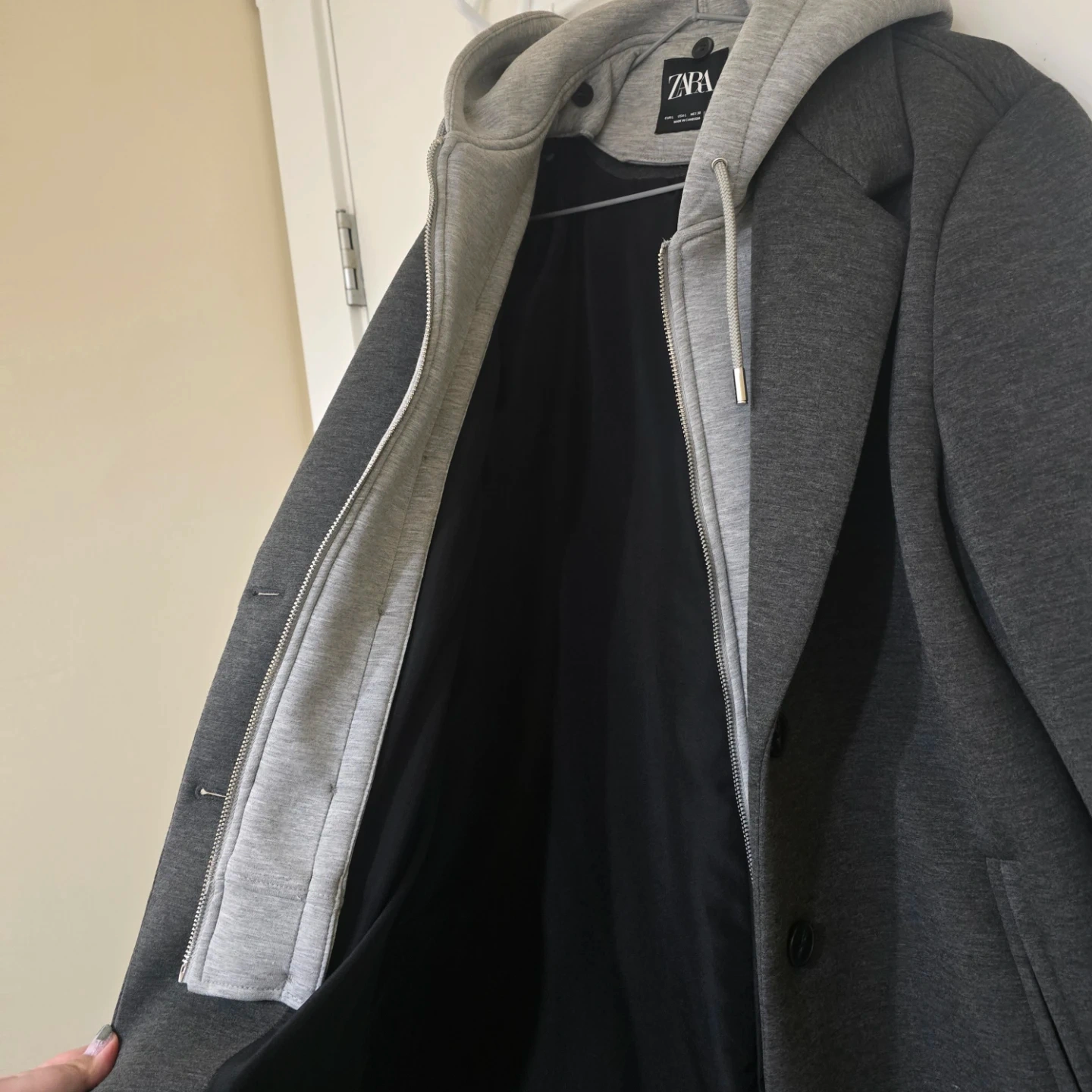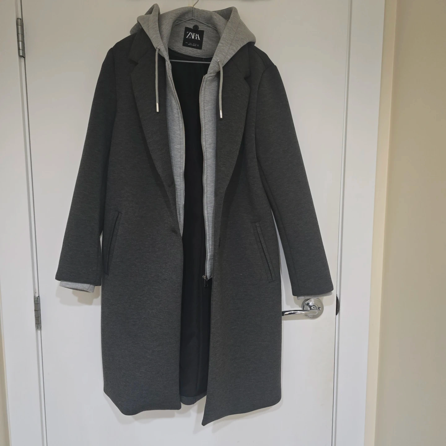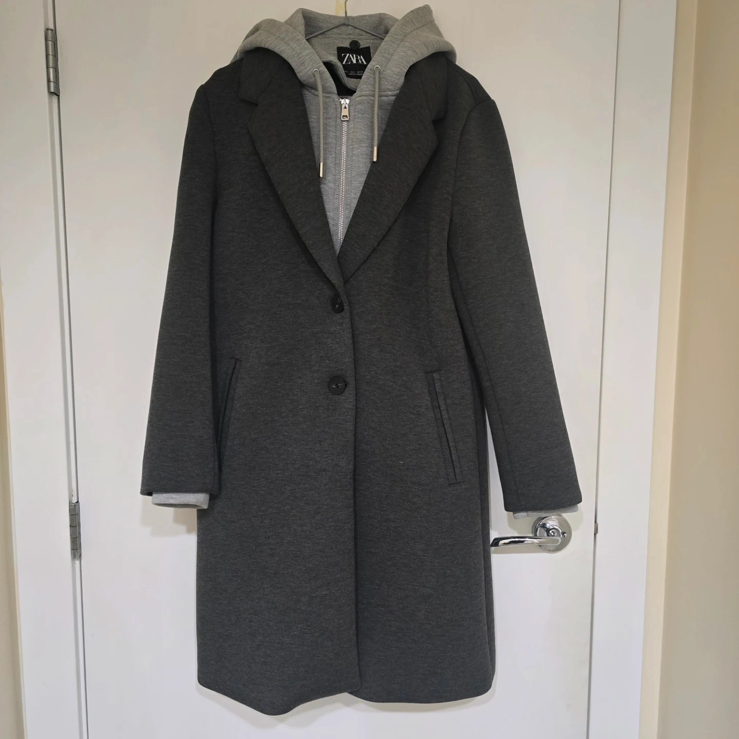 This ZARA coatigan features a grey outer shell with a contrasting grey hooded inner layer and a full zip closure. It has two front buttons and two side pockets.