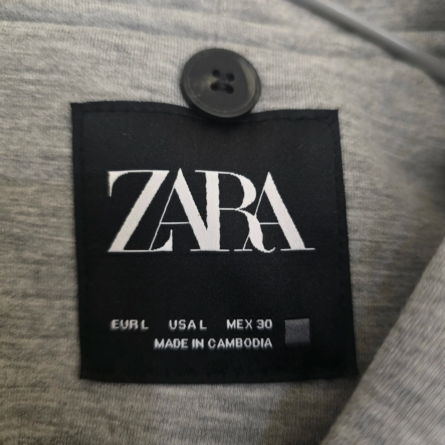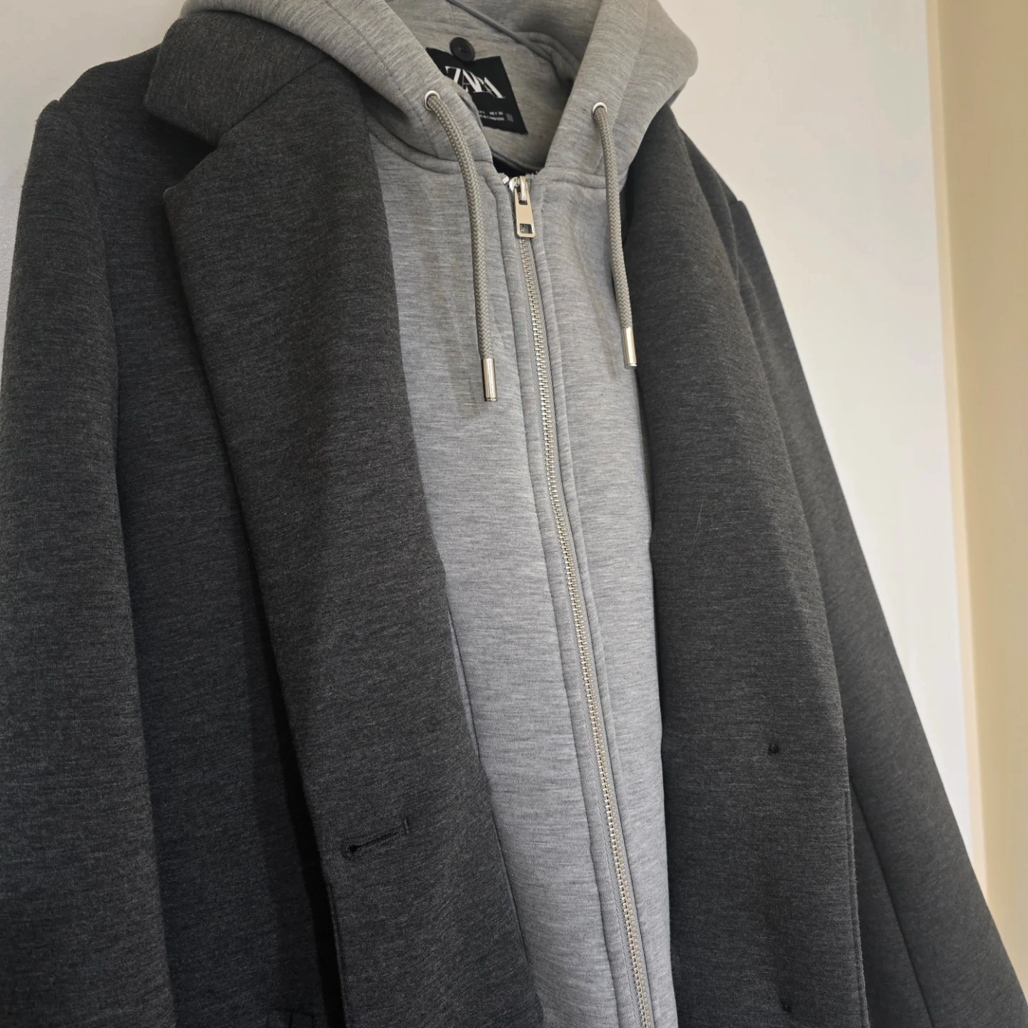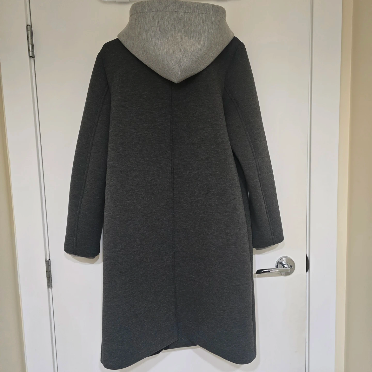 This ZARA coatigan features a grey outer shell with a contrasting grey hooded inner layer and a full zip closure. It has two front buttons and two side pockets.