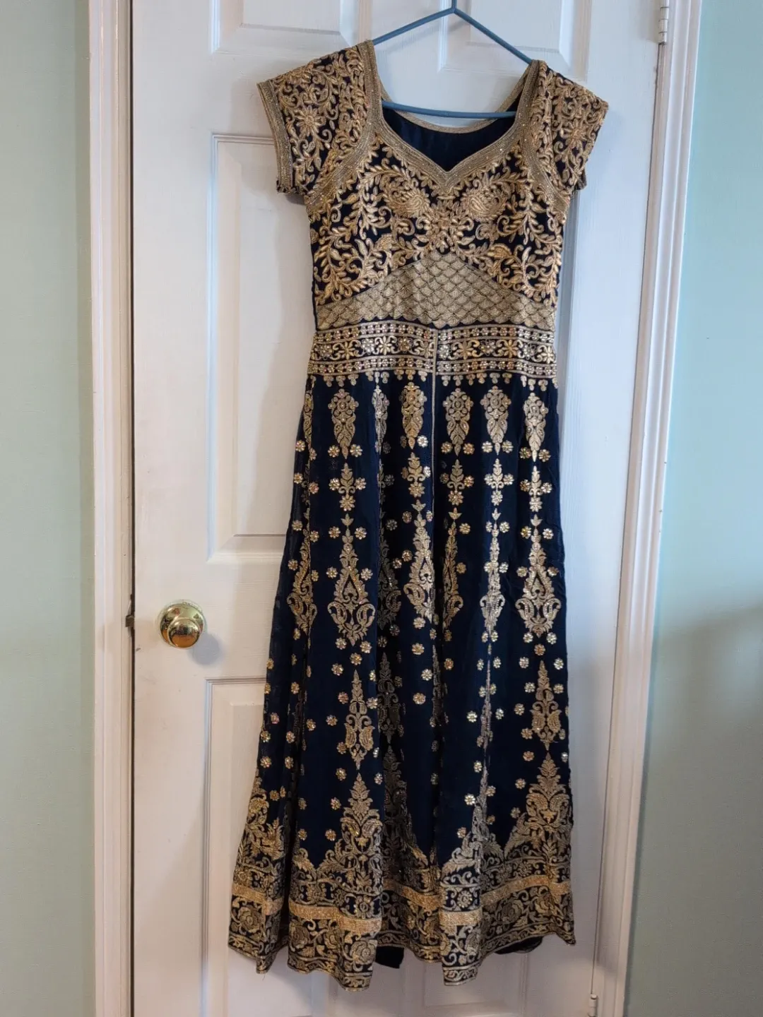 Navy blue Anarkali dress with gold embroidery. It features intricate patterns on the bodice and skirt. Material is likely a blend with sequin embellishments.