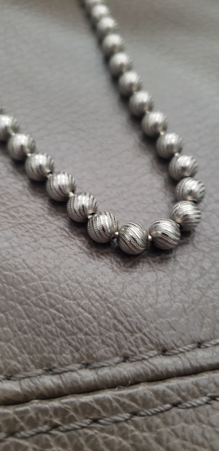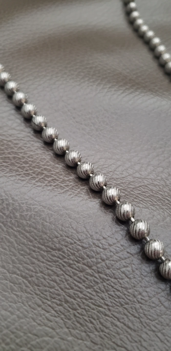 A feel good necklace of 6mm (1/4") metal balls or beads attached together like a chain. The beads are brass not steel and the finish is a soft silver tone on a lovely textured swirled surface. The necklace is 36 inches long.