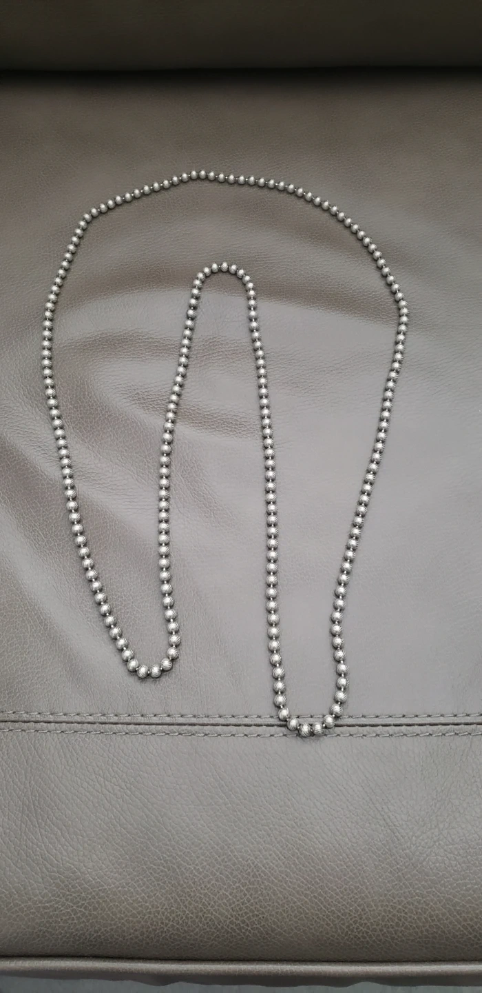 A feel good necklace of 6mm (1/4") metal balls or beads attached together like a chain. The beads are brass not steel and the finish is a soft silver tone on a lovely textured swirled surface. The necklace is 36 inches long.