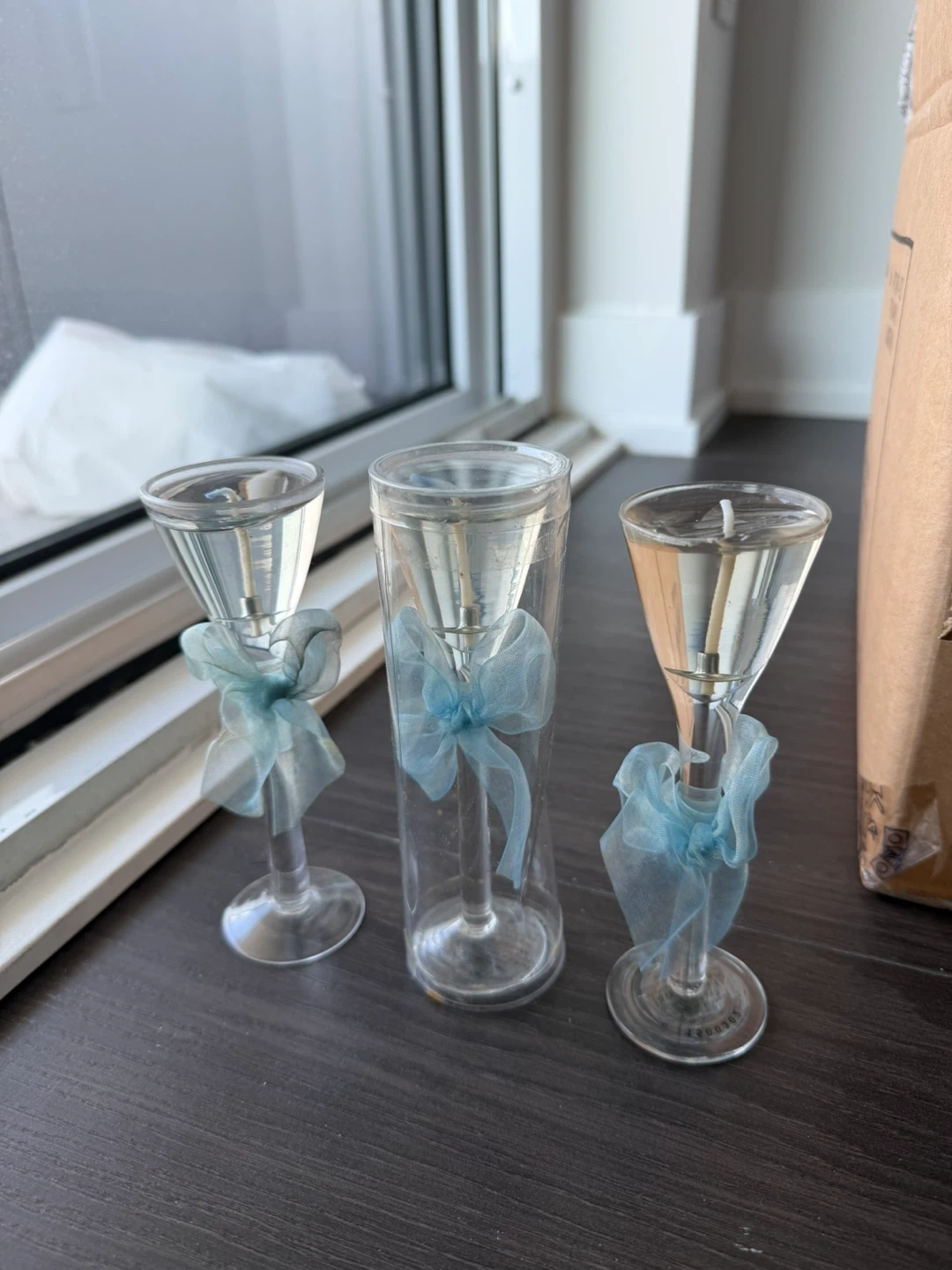 Set of 6 glass candle holders, each adorned with a light blue ribbon. Can be used for party giveaways, or decor.