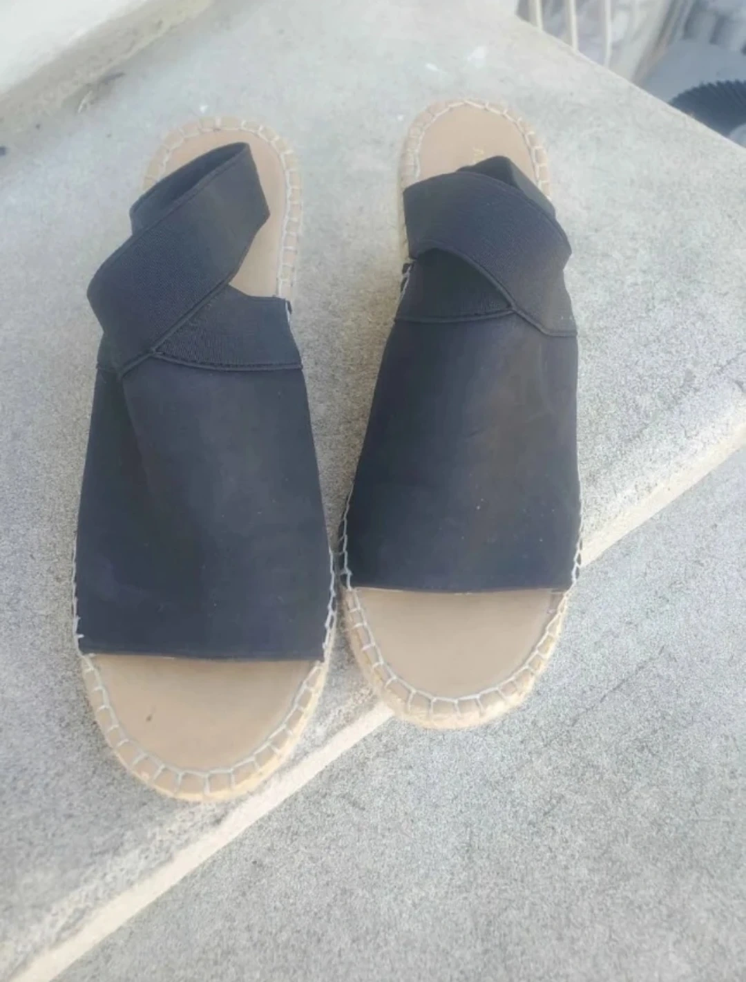 Adrienne Vittadini wedge espadrille sandals. Black elastic crisscross straps with an open toe design. Espadrille jute detailing along the sole. Size 7.5 Medium. Pickup location eglinton and dufferin area