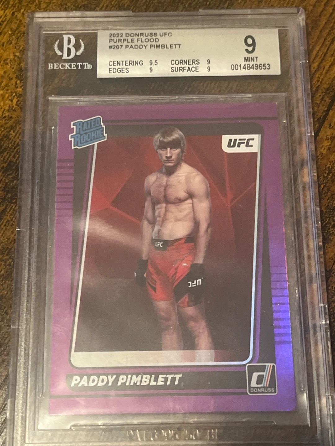 This is the 2022 Donruss UFC Purple Flood card featuring Paddy Pimblett. It's a Rated Rookie card, graded Mint 9 by Beckett. The card's grading details include centering 9.5, edges 9, corners 9, and surface 9.