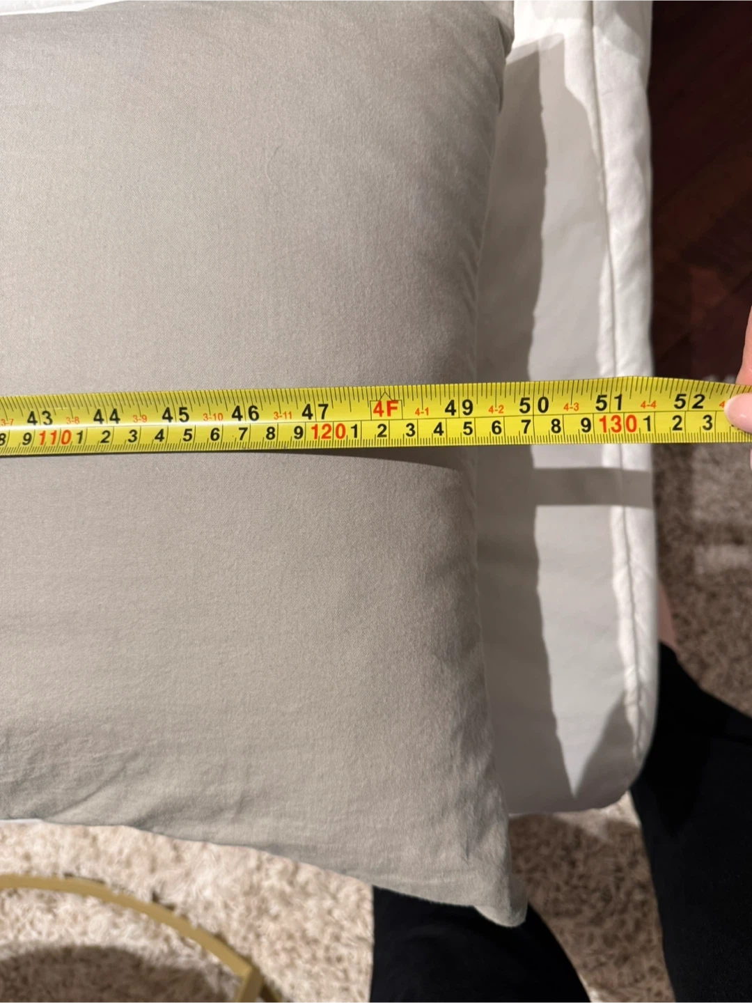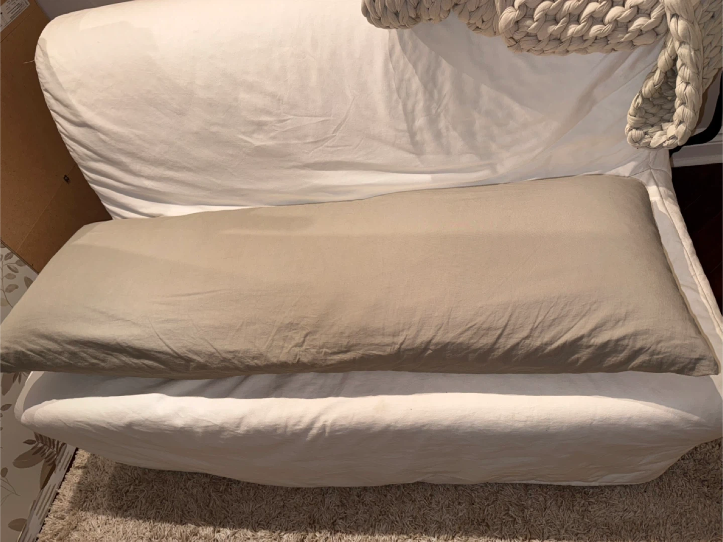 A long bolster pillow in a light grey colour. It's approximately 50 inches long. Provides extra support and comfort for lounging or sleeping.