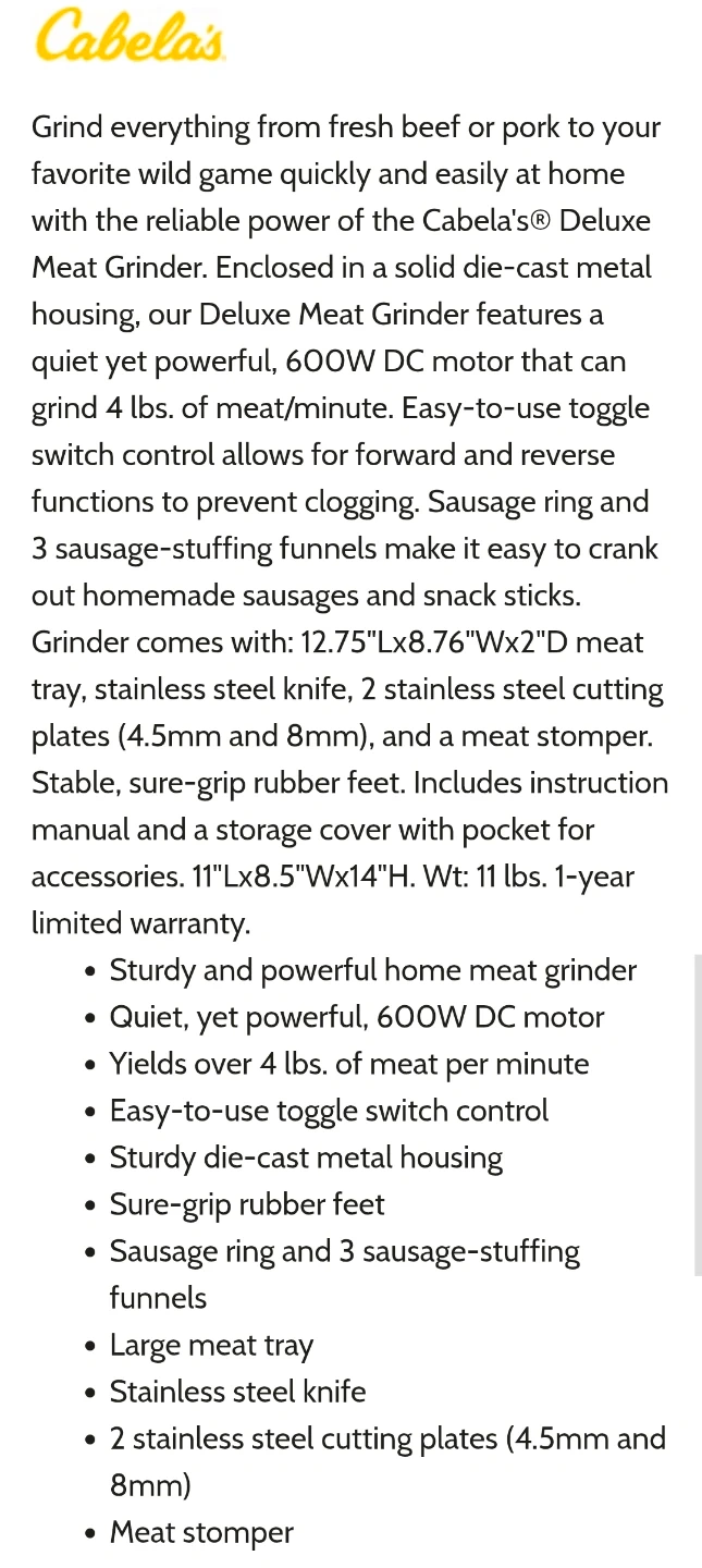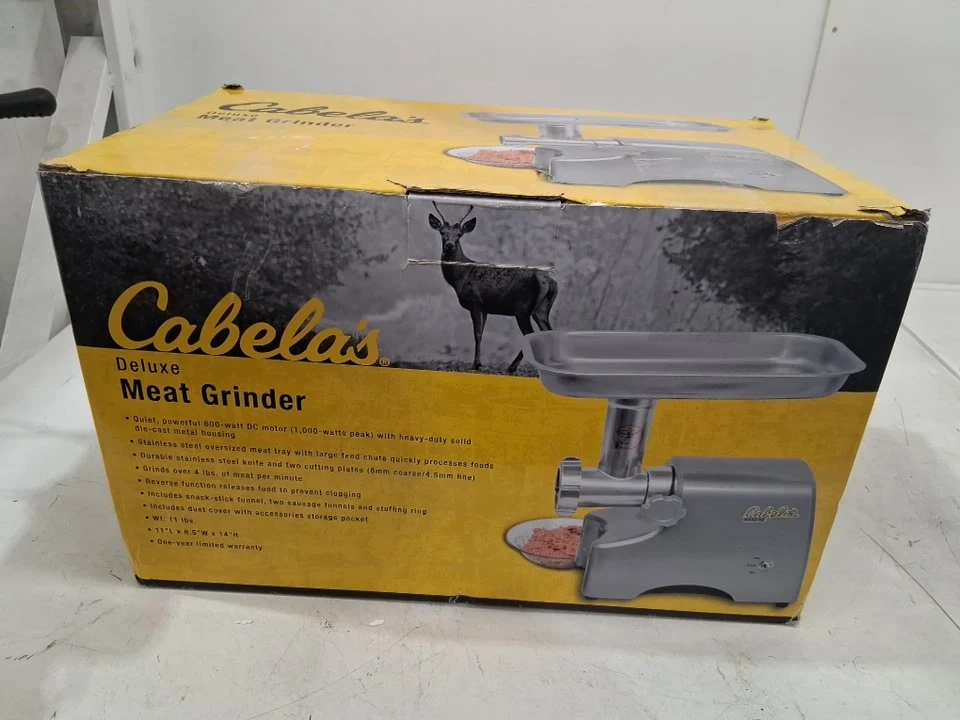I'm selling a Cabela's Deluxe Meat Grinder, a sturdy and powerful appliance for grinding everything from fresh beef to pork. This grinder features a quiet yet powerful 600W DC motor, capable of grinding over 4 lbs of meat per minute, making it easy to whip up sausages and snack sticks.