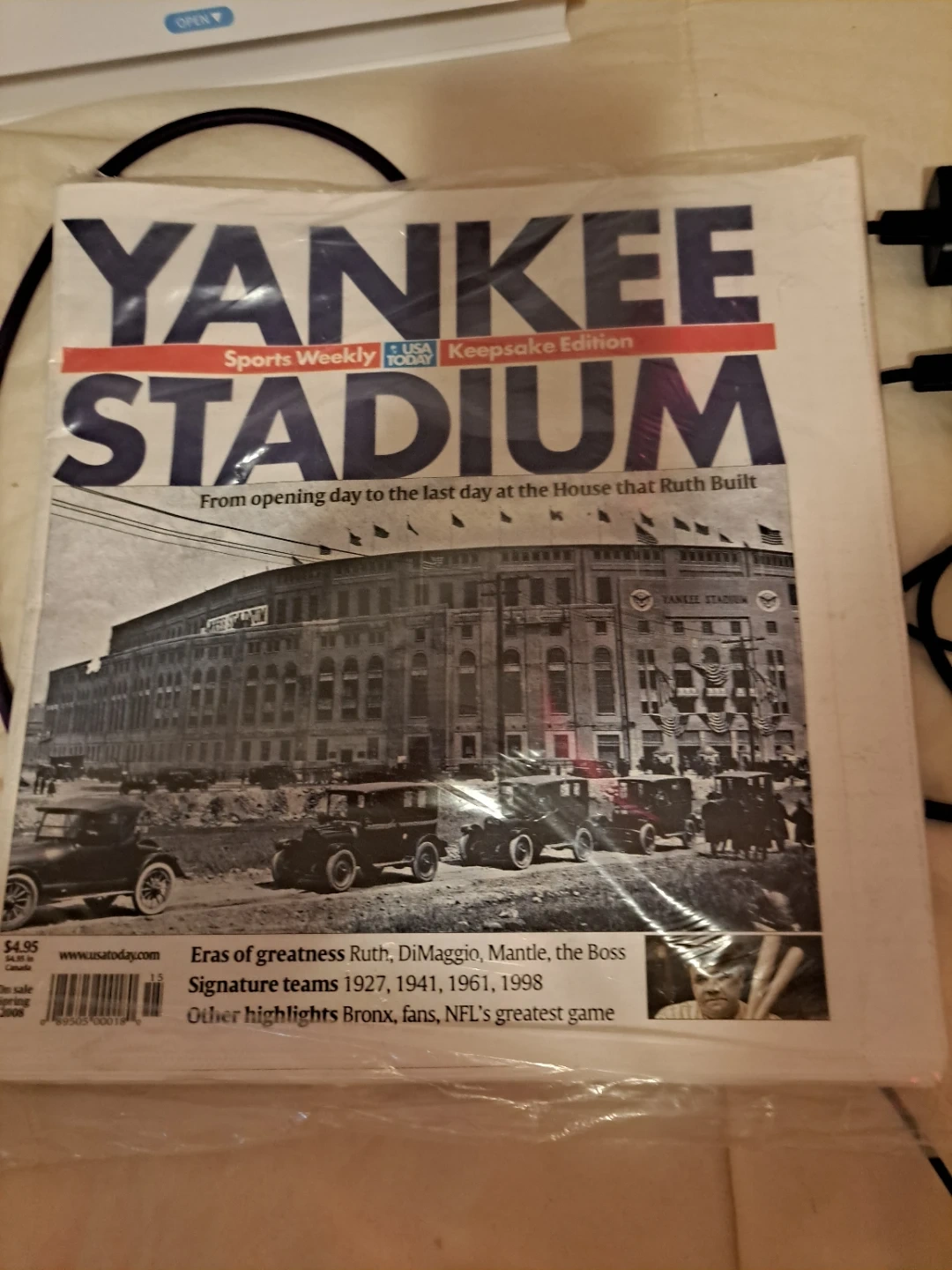 This is a USA Today Sports Weekly Keepsake Edition about Yankee Stadium. It covers eras of greatness with signature teams from 1927, 1941, 1961, and 1998. Other highlights include the Bronx, fans, and the NFL's greatest game. Printed in Spring 2008.
