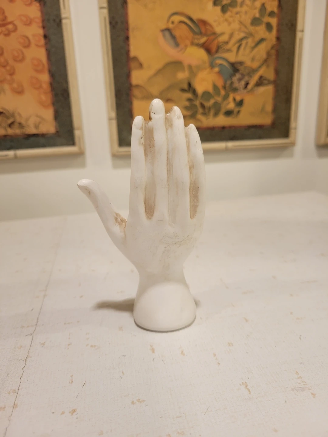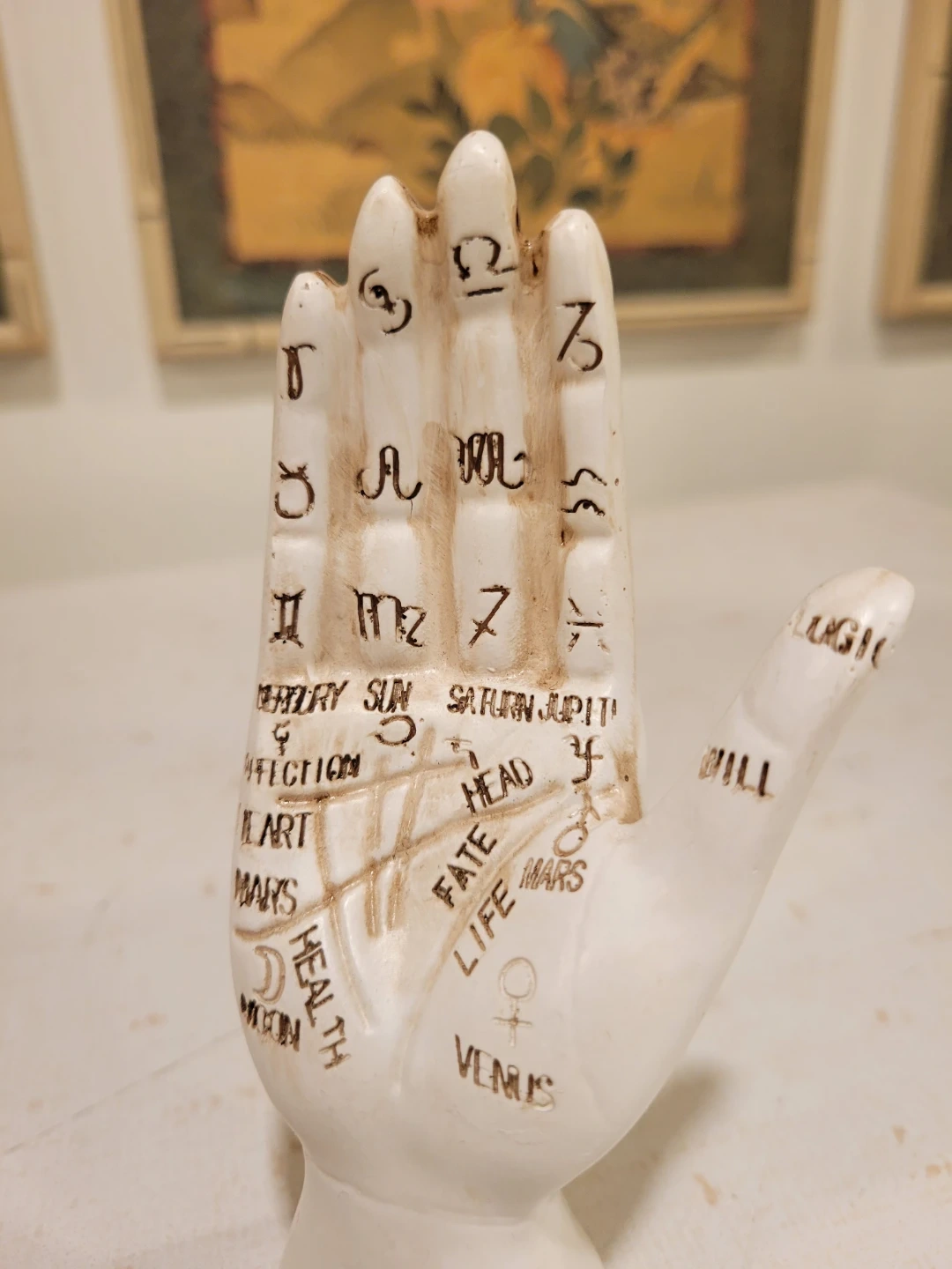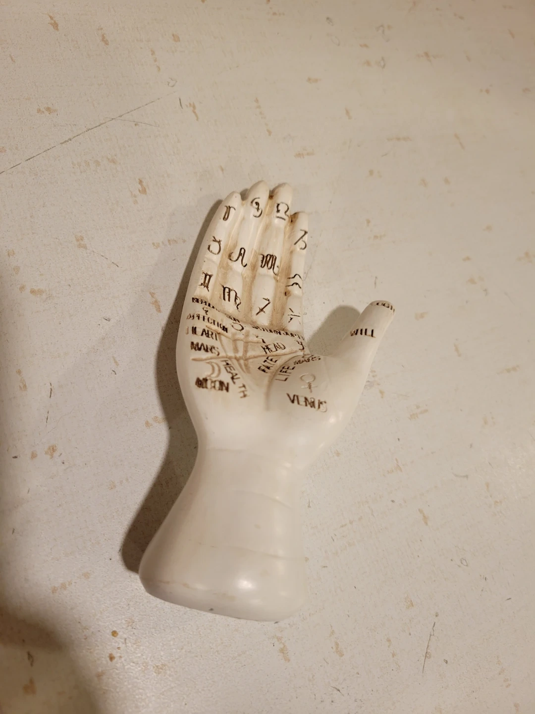 Explore the mystical arts with this vintage palmistry hand, a unique decorative piece showcasing the ancient practice of palm reading. The hand features detailed markings and symbols associated with palmistry. It is in used condition, showing some signs of age that add to its vintage charm.