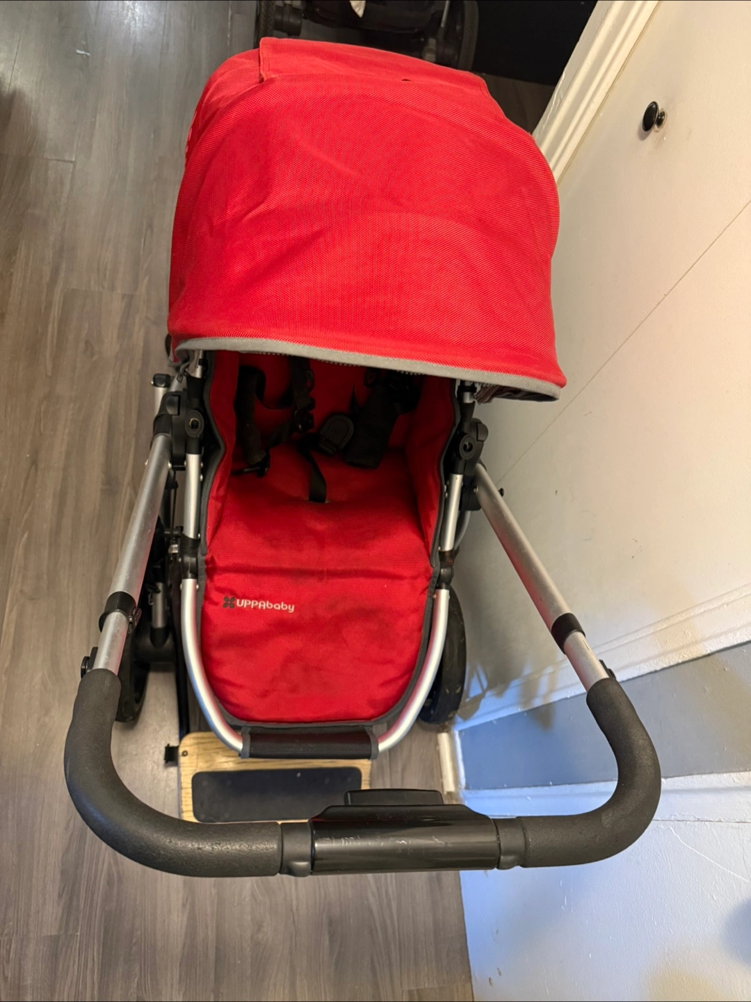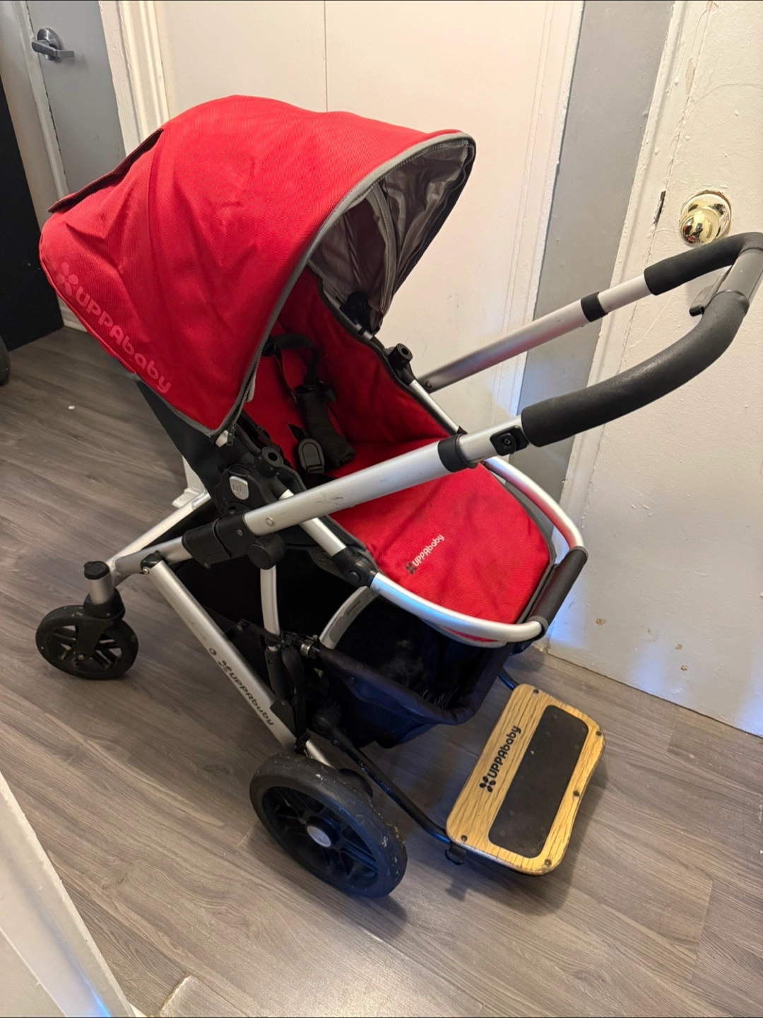 Selling a used UPPAbaby stroller in red! It's in good condition and ready for a new home. Perfect for taking your little one around town, this stroller is both stylish and functional. It has some signs of wear, but overall it's still a great stroller! It includes piggy back