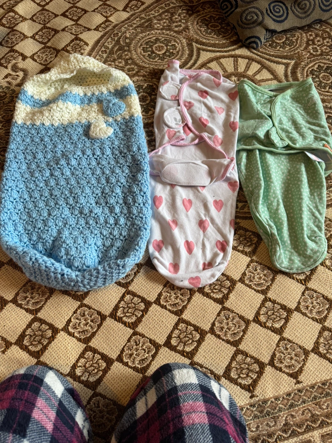 Selling a set of baby swaddles with various designs. They're in good condition and ready to keep your little one snug and secure! The designs include bunnies, seashells, clouds, hearts and polka dots 5$ each
