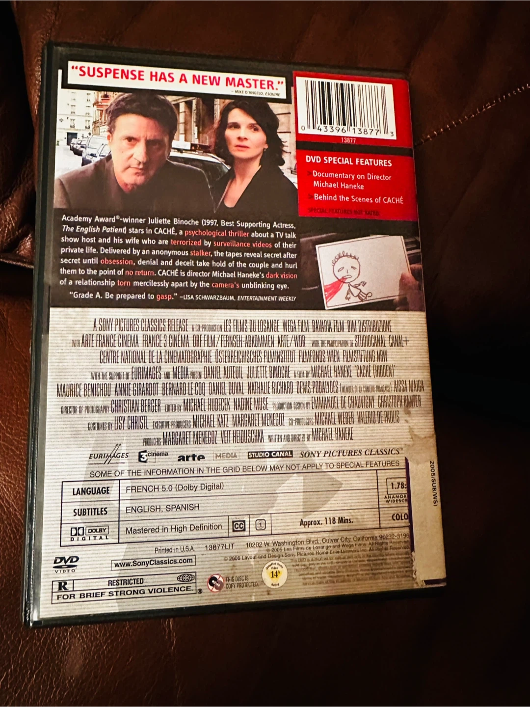 This is the DVD for the film Cache (Hidden), directed by Michael Haneke. It features Daniel Auteuil and Juliette Binoche. The DVD includes English 5.0 Dolby Digital audio and is rated R for brief strong violence.
