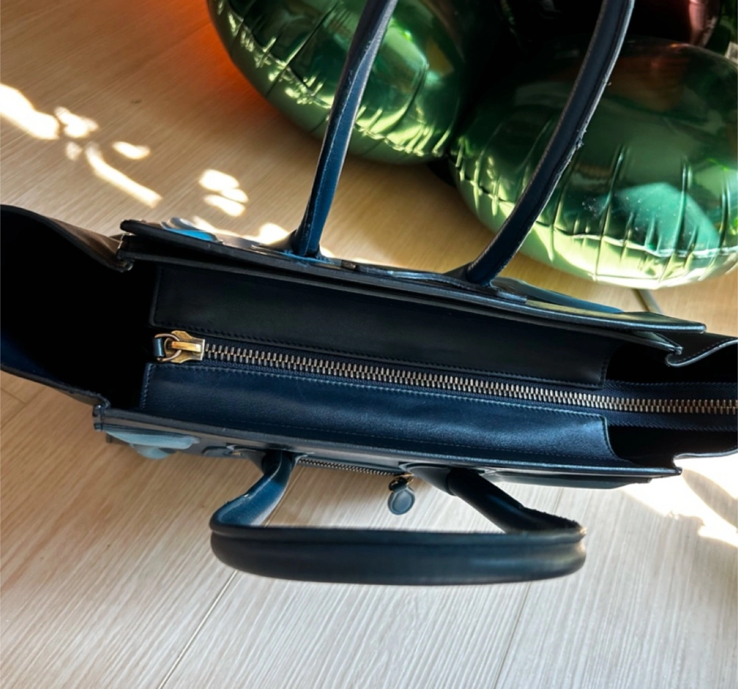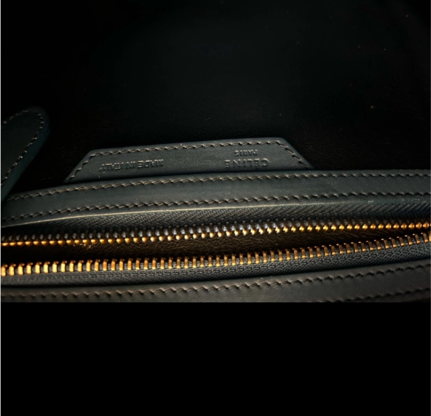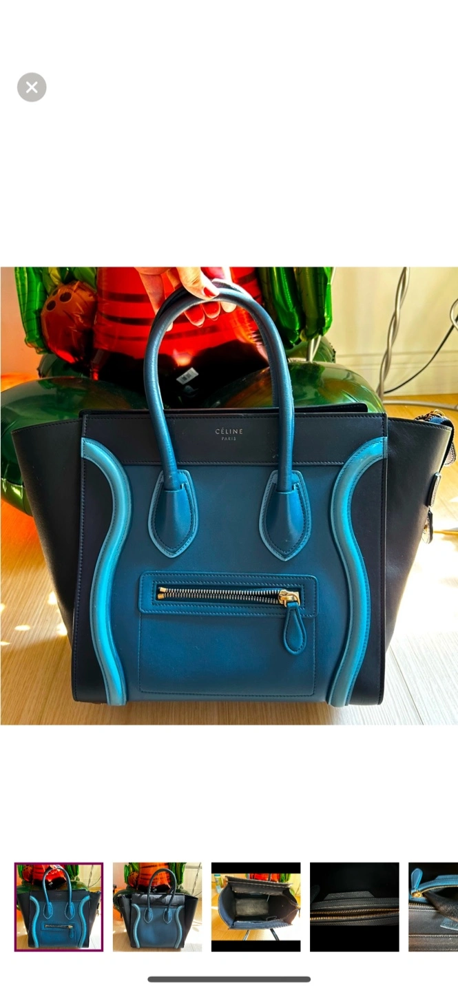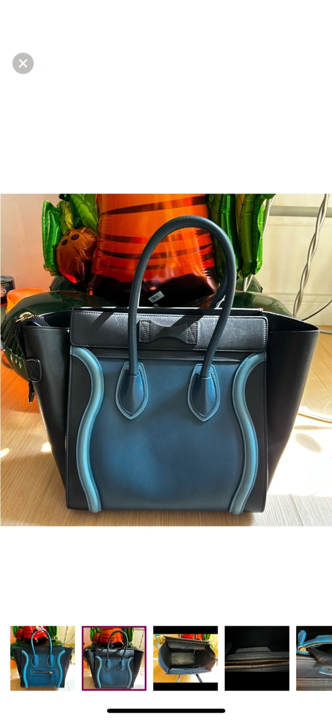 Pre-owned Celine tote. Beautiful blue and black leather. Top handles. Zip closure. Interior pockets.