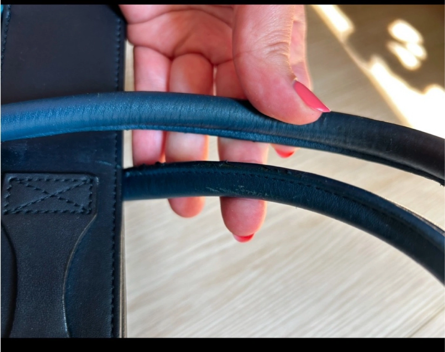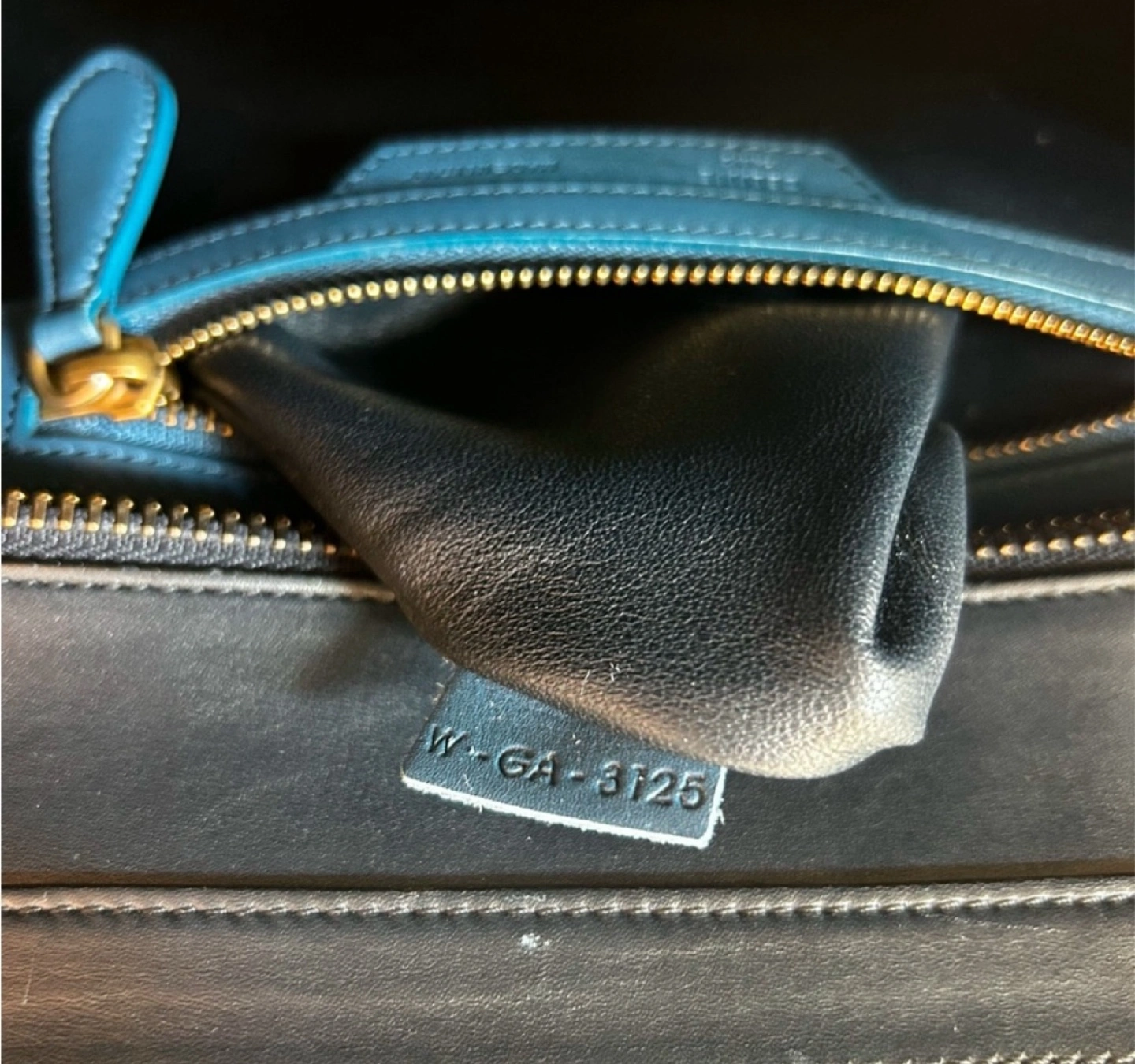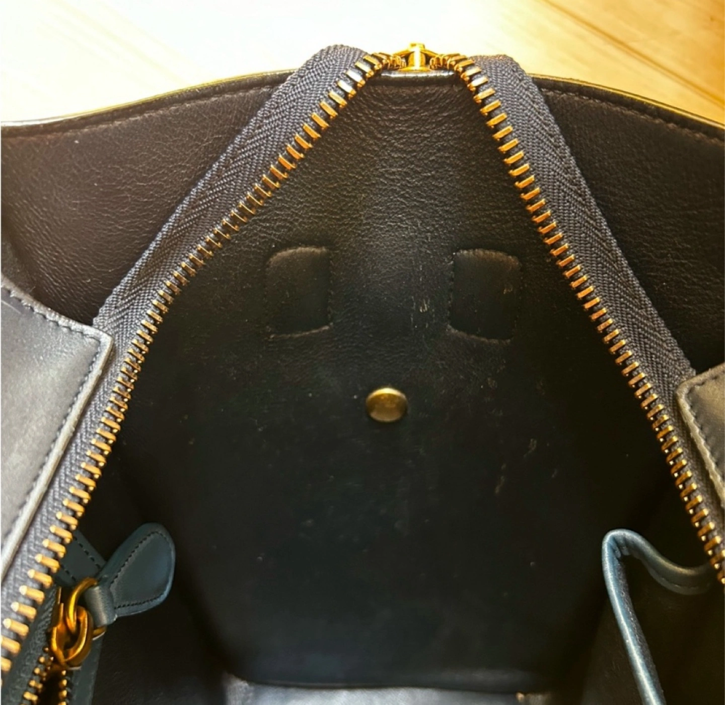 Pre-owned Celine tote. Beautiful blue and black leather. Top handles. Zip closure. Interior pockets.