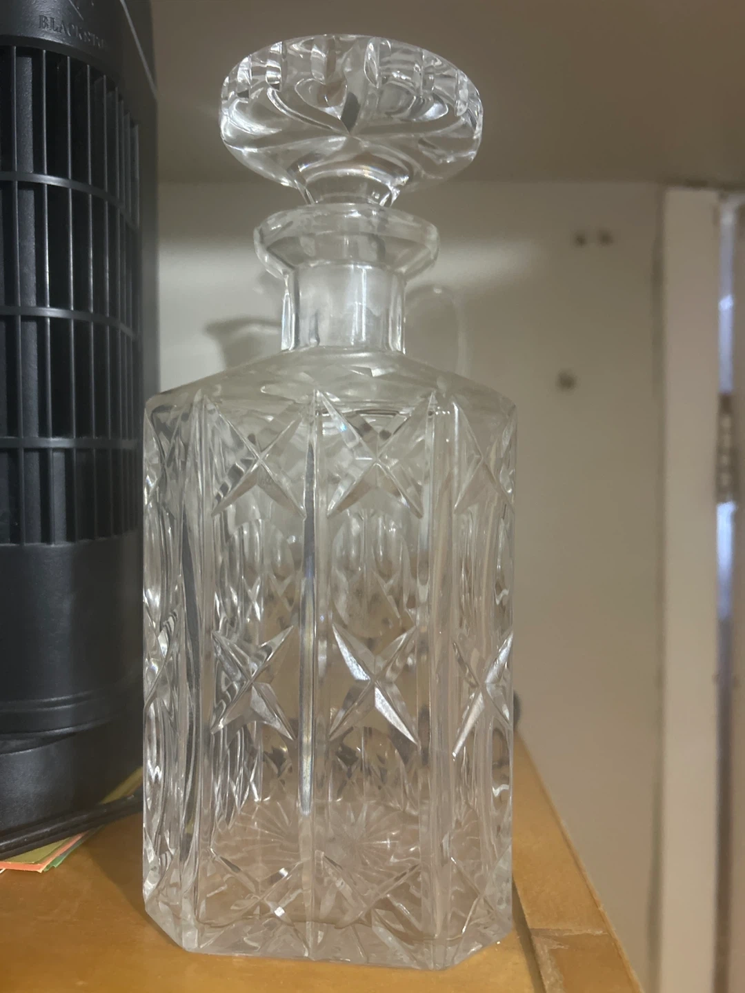 This is a beautiful crystal glass decanter with an intricate cut-glass design and a matching stopper. It's perfect for serving spirits or water in style. The glass is clear and heavy, showing off a detailed pattern of stars and diamonds.