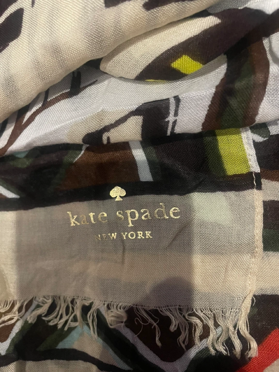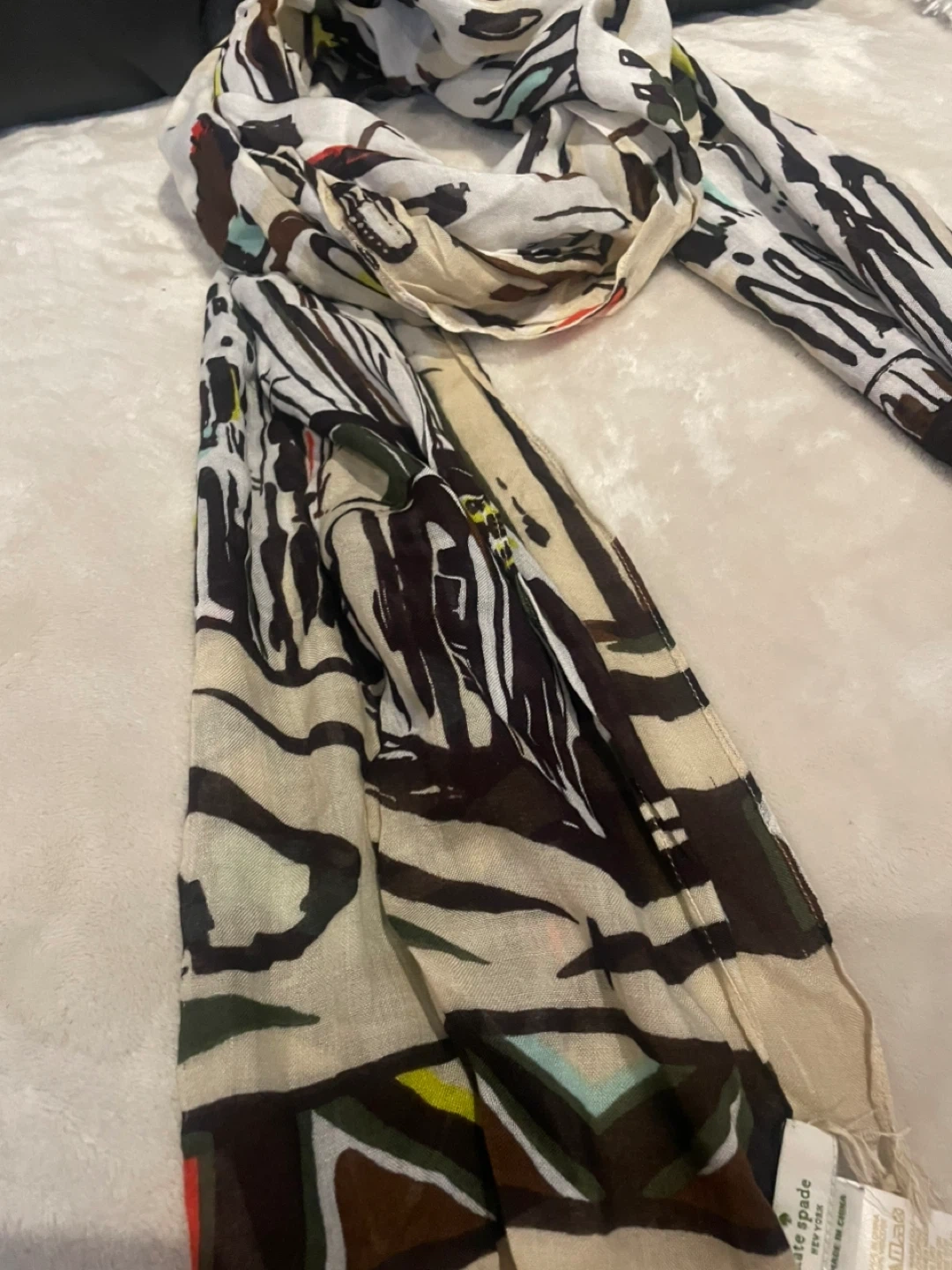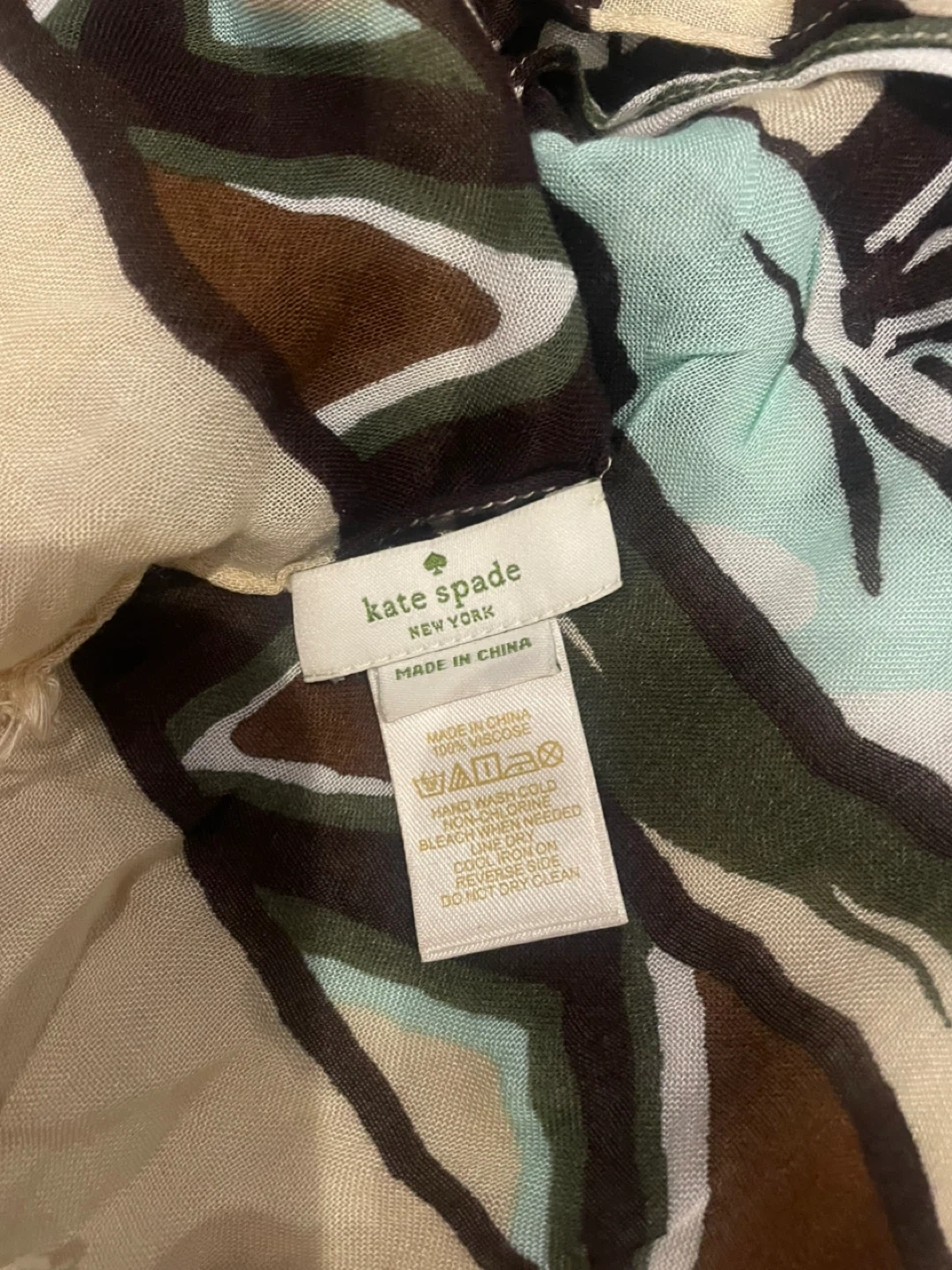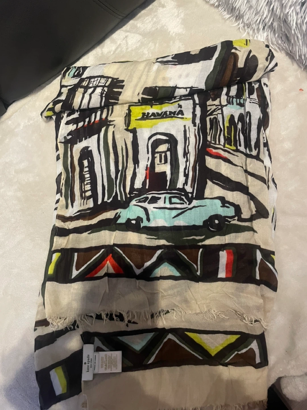 This is a Kate Spade New York scarf featuring a Havana street scene with a vintage car. It's made of 100% viscose. Hand wash cold, bleach when needed, cool iron on reverse, do not dry clean.