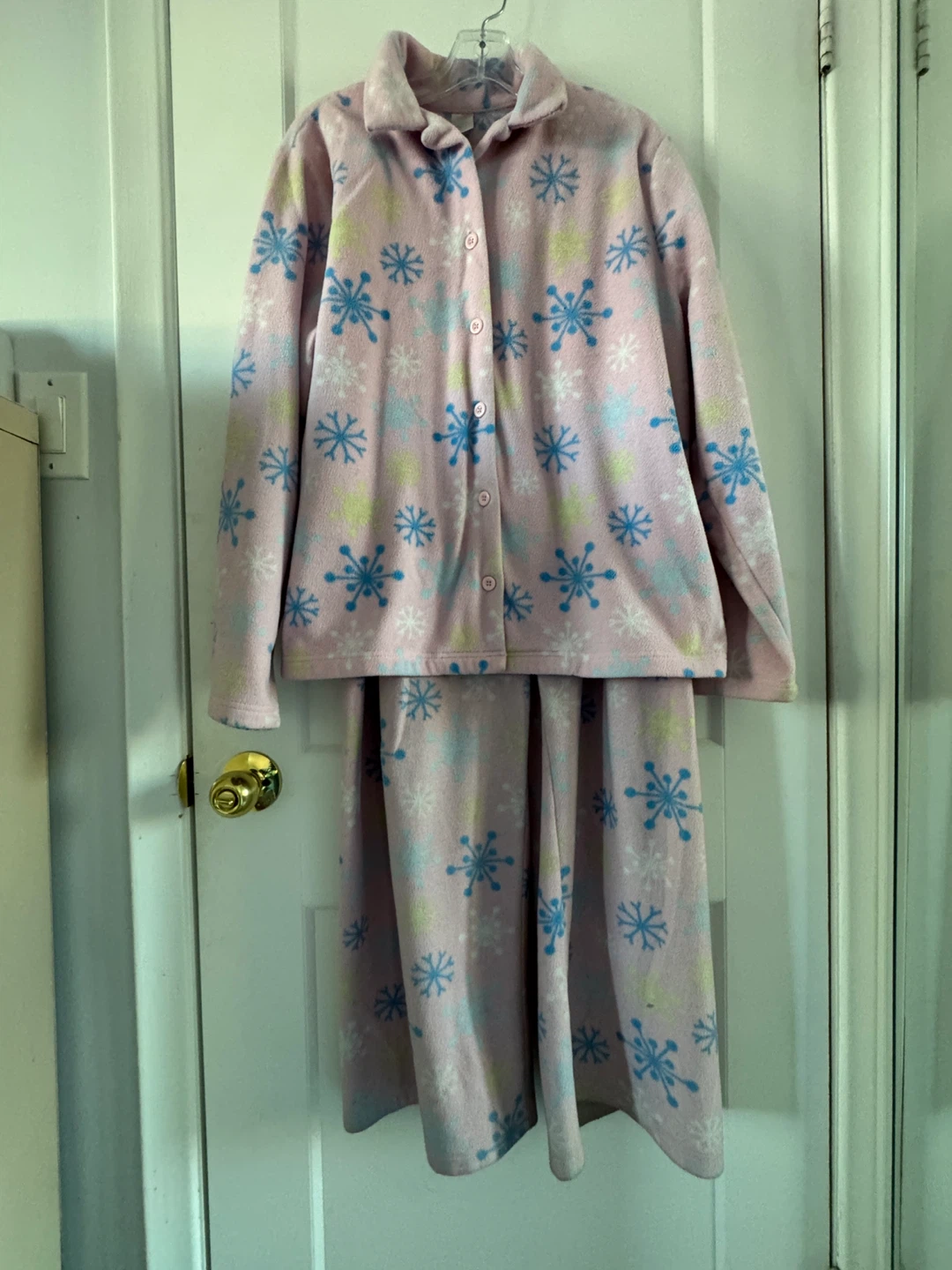 Comfy pink fleece pajama set from Gymboree. It's size XL and features a cute snowflake pattern. Made from 100% polyester for warmth.