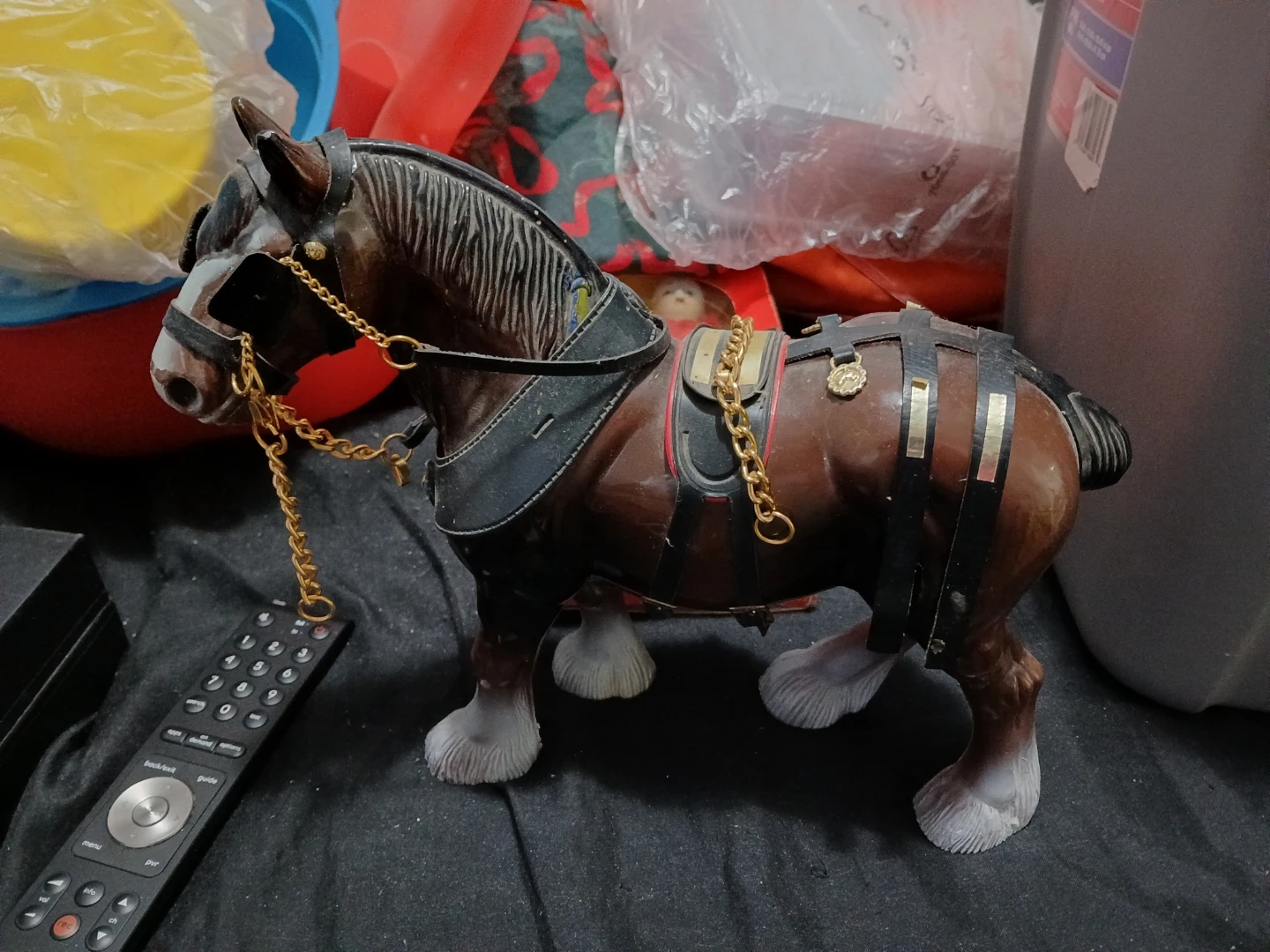 This is a detailed figurine of a Budweiser Clydesdale horse, complete with harness and gold chains. It's a great display piece for collectors or fans of the iconic brand. The figurine is made of resin and stands about 10 inches tall.