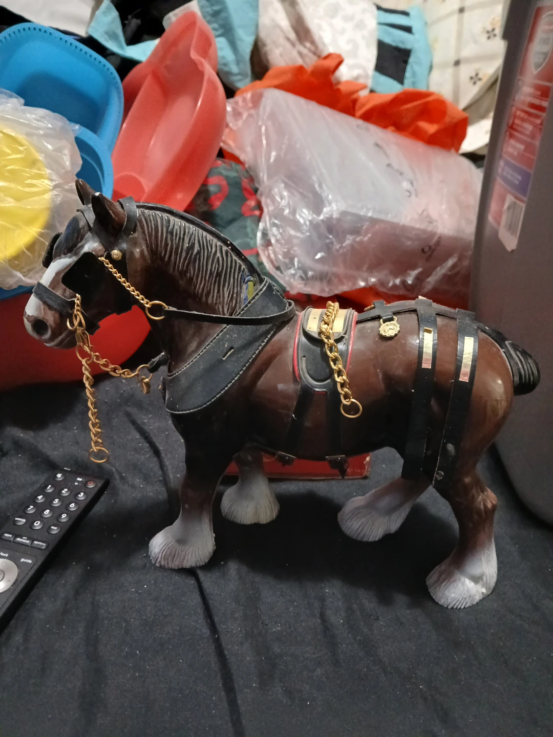 This is a detailed figurine of a Budweiser Clydesdale horse, complete with harness and gold chains. It's a great display piece for collectors or fans of the iconic brand. The figurine is made of resin and stands about 10 inches tall.