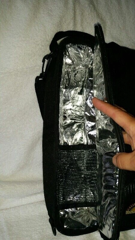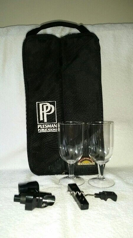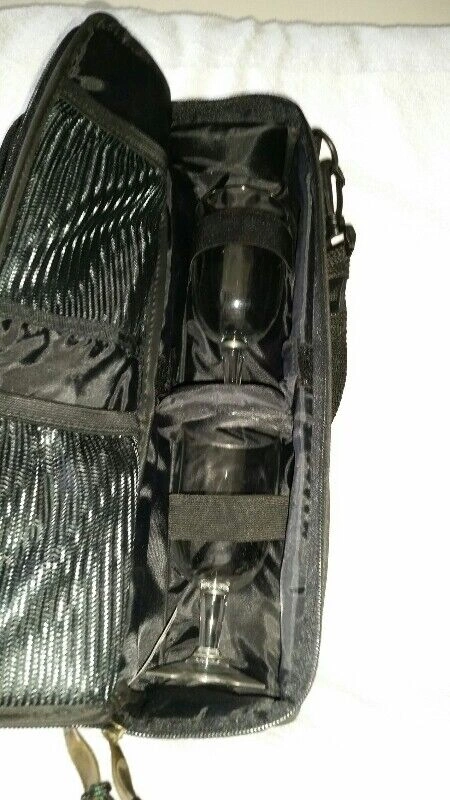 Never used, black carrying case with accessories, convenient for parties, picnics, and getaways. Features a sturdy handle with an adjustable, detachable shoulder strap. One side is thermal insulated to keep your beverage cold, and the other holds 2 acrylic wine glasses (included). If you remove the glasses, you can fit a second bottle. Dimensions: 14" tall, 8" wide, 4" depth. Set also includes a corkscrew and pour/stopper. Has the Plesman Publications logo on the front. Made by California Innovations. Pickup in Brampton, near Queen and Kennedy.